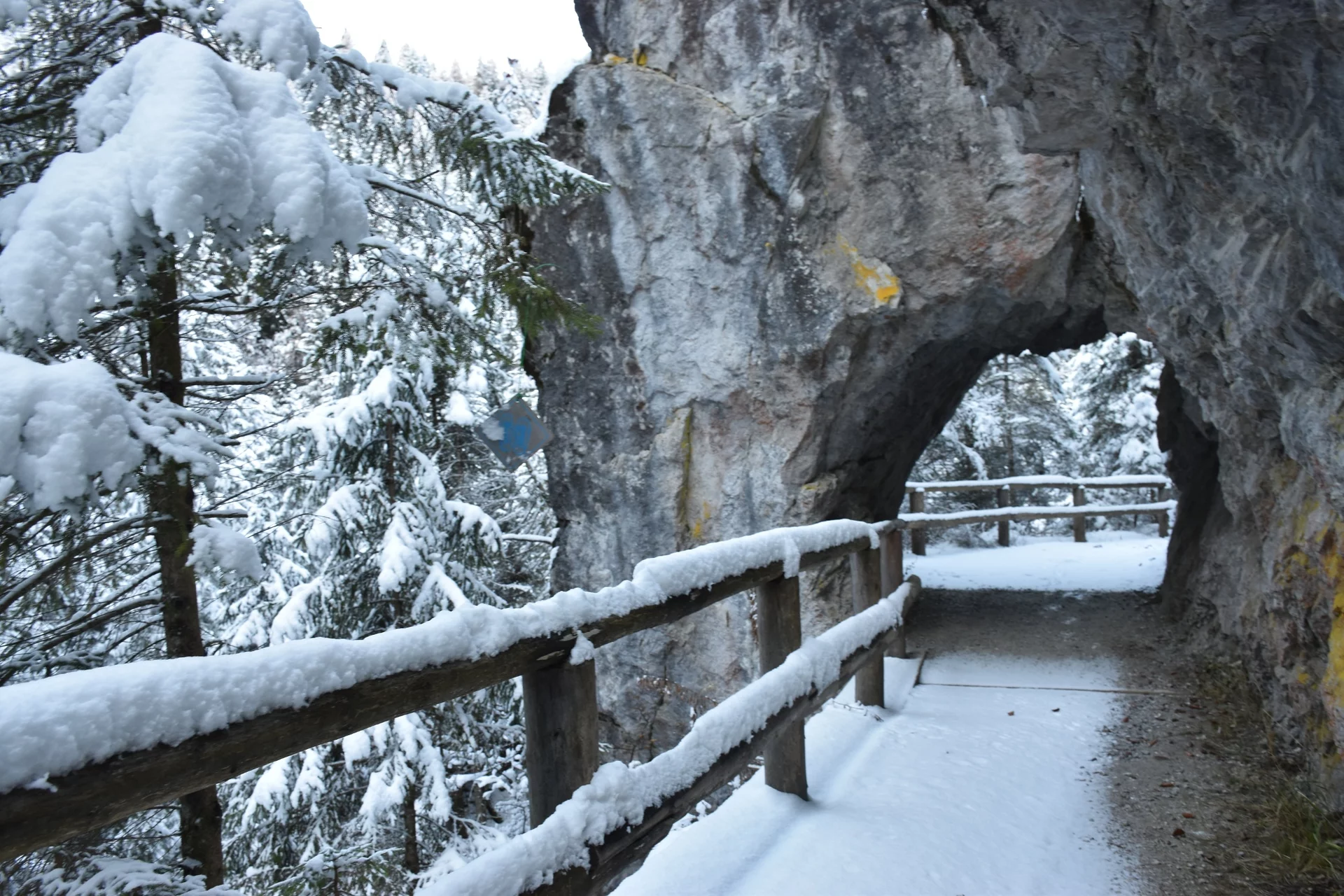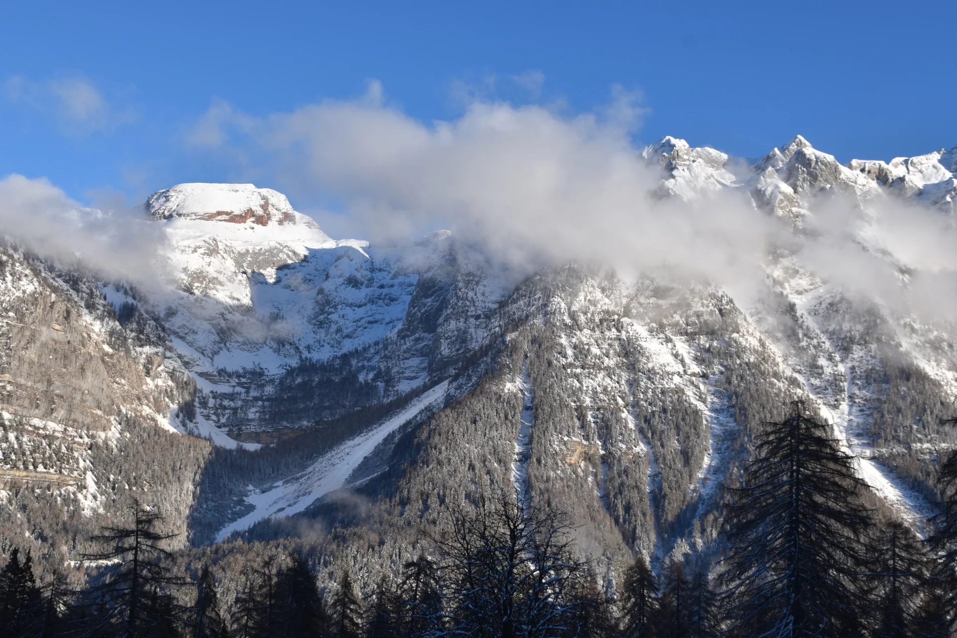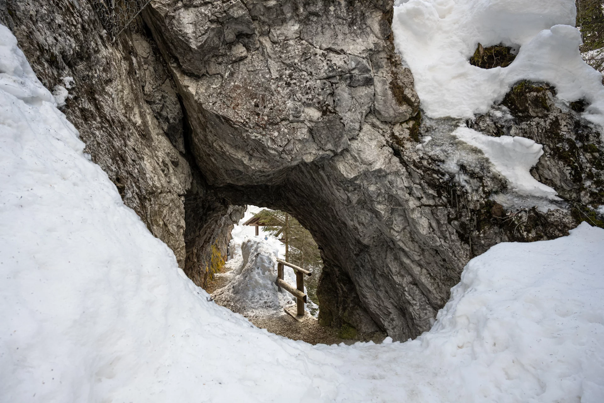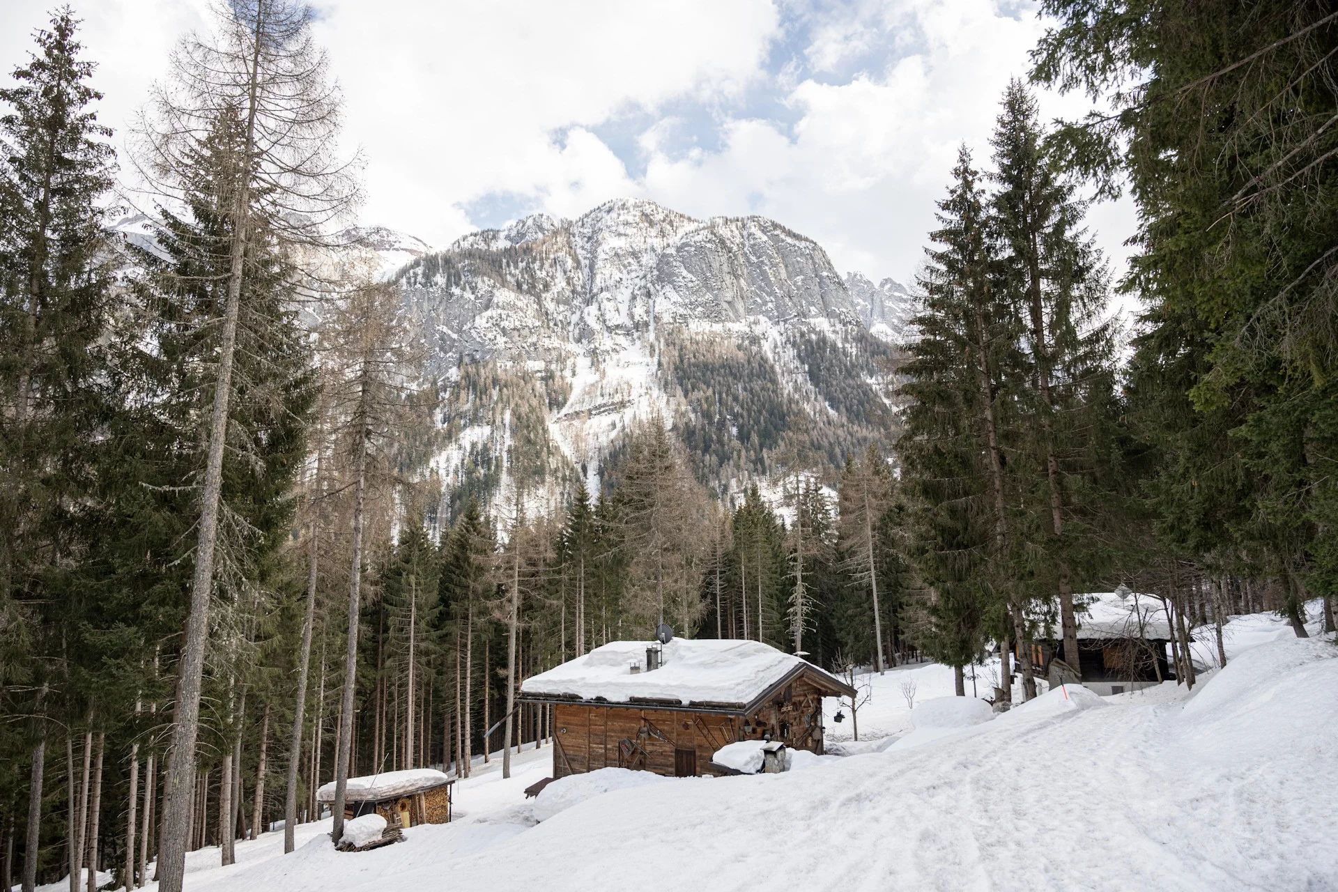 Nachdem du eine alte calcara erreicht hast, in der früher gelöschter Kalk hergestellt wurde, steig durch den dichten Lärchenwald empor, der die Hänge des Doss di Santa Brigida bedeckt, wo einst ein Pilger- und Wandererhospiz stand, heute Malga del Doss genannt. Am Abzweig, der zum alten Hospiz führt, biege rechts auf den in den Fels gehauenen Pfad ab. Hier tritt der Bach Meledrio aus einer engen Felsenschlucht hervor und bildet einige Wasserfälle. Es lohnt sich, diesen stimmungsvollen Anblick zu bewundern. Nach der kurzen Pause steig weiter zu den Masi di Ronzola hinauf, bis du die SS 239 auf Höhe des Ortes Belvedere di Folgarida erreichst.