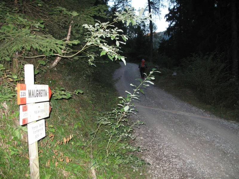 Weiter auf einem Nebenweg aus Schotter bis zur Kreuzung mit einem schöneren Schotterweg (Schild zur Malghetta).