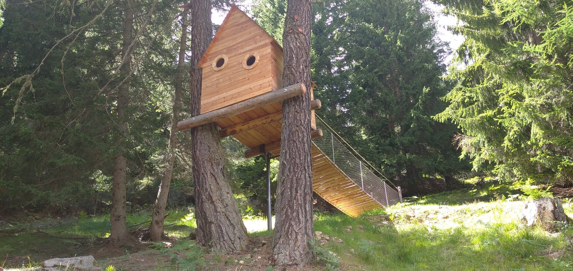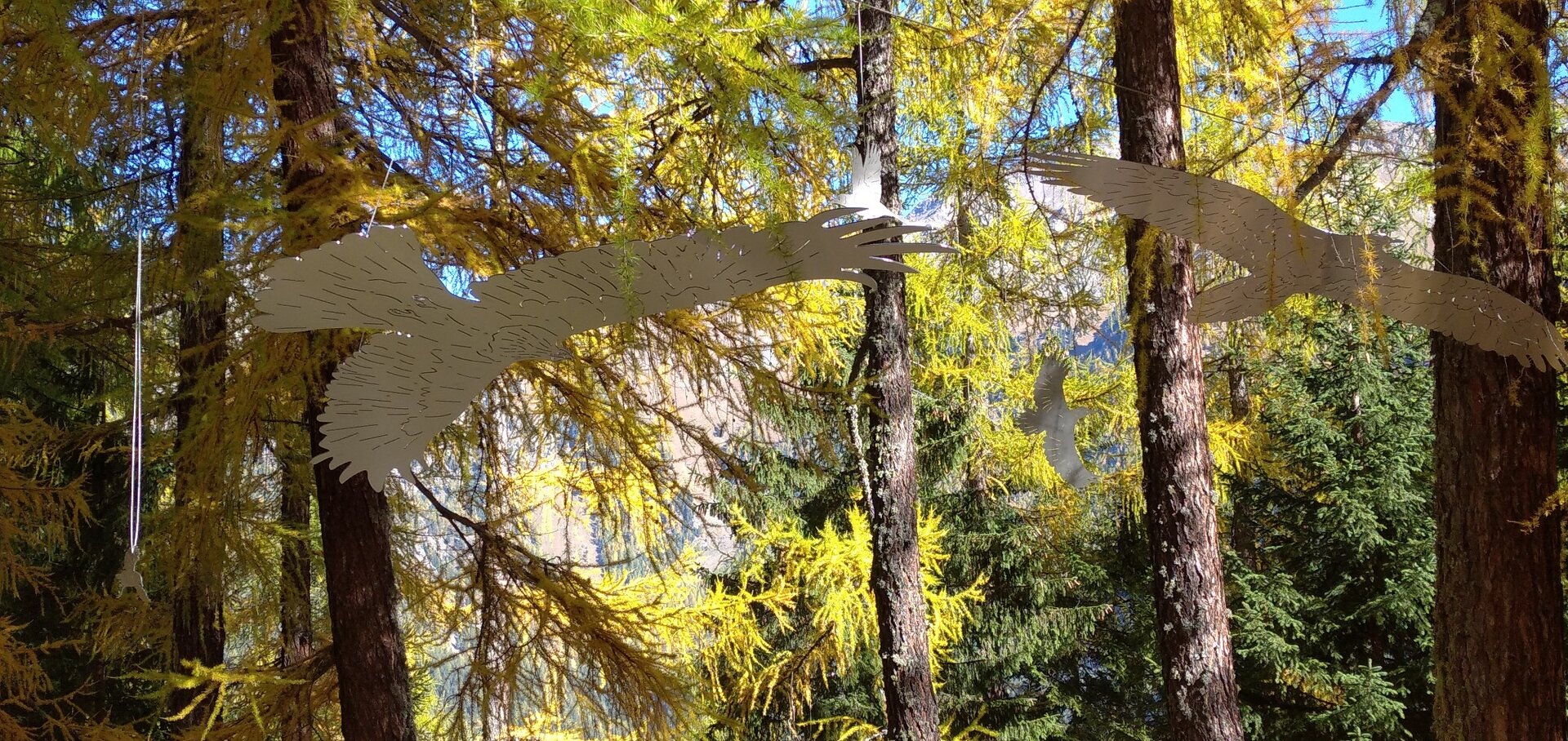 Bequemer Weg mit einer Reihe von "Attraktionen", die einige Aspekte des Lebens der Waldbewohner Vögel erzählen und idealerweise dazu bringen, sich in ihre Charakteristiken und Gewohnheiten hineinzuversetzen. Man kann die Aussicht von oben wie ein Adler bewundern, auf ein Baumhaus steigen, den Vogelgesang mit hölzernen Verstärkern hören, in einem Nest sitzen.