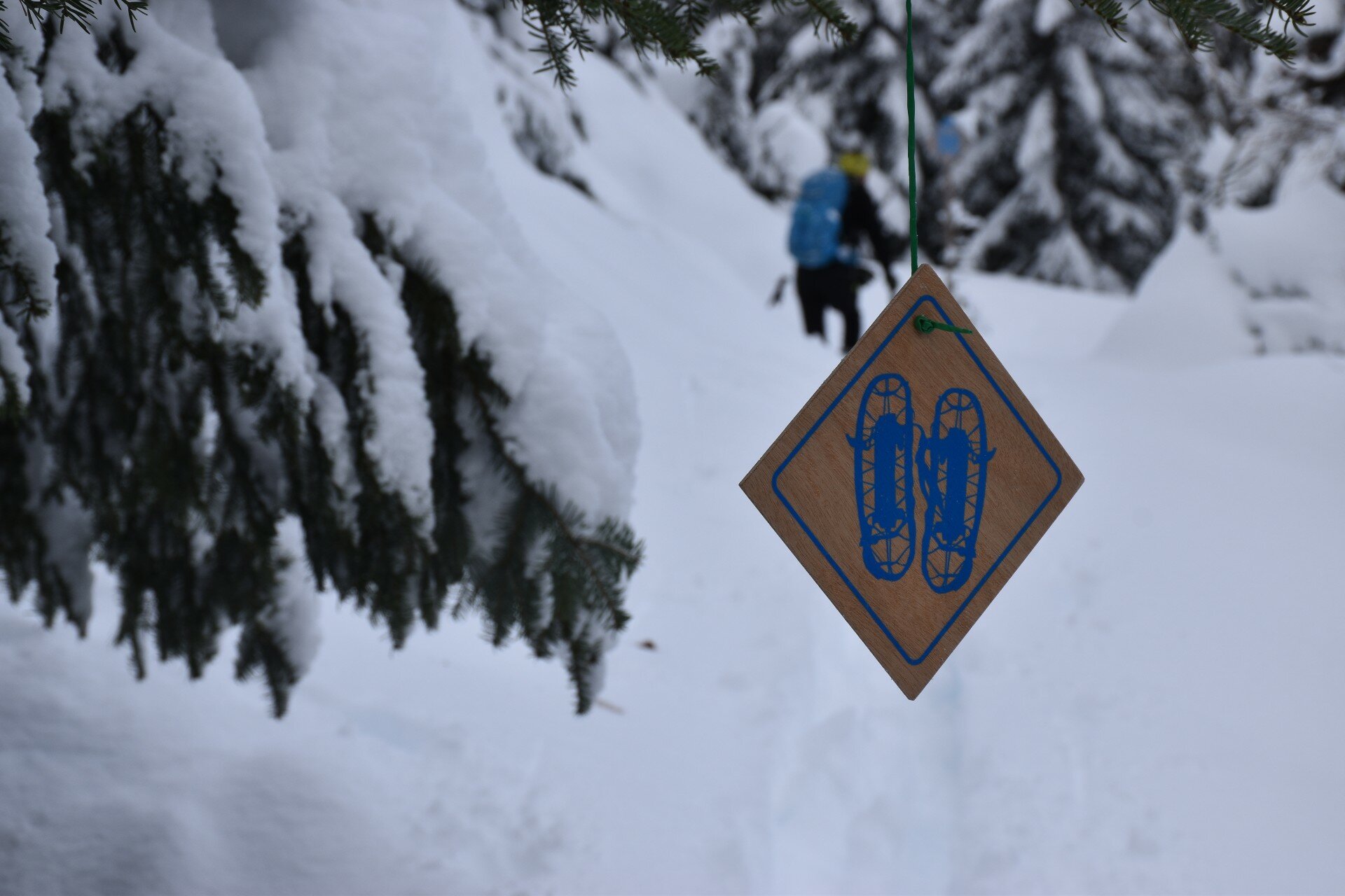Einfache Schneeschuhwanderung, die auf gekennzeichneten Wegen verläuft, markiert mit einem speziellen Schild, das einen Schneeschuh zeigt.