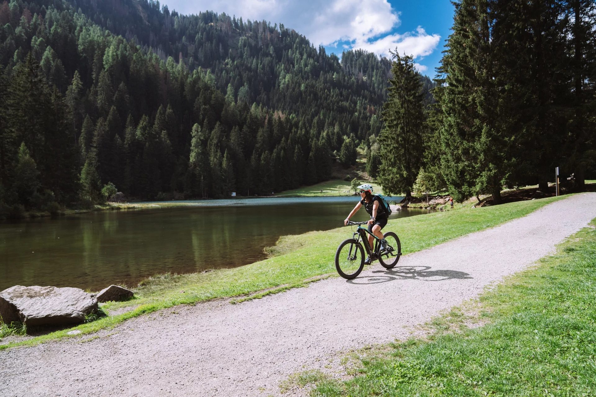 From here, you ride a slightly uphill dirt track that, skirting the slopes of Monte Salvat, quickly leads to Lake dei Caprioli, a suggestive glacial lake around which you can complete an easy and panoramic loop and enjoy a lunch break with local dishes at Chalet Lake dei Caprioli, right on the lake shore.