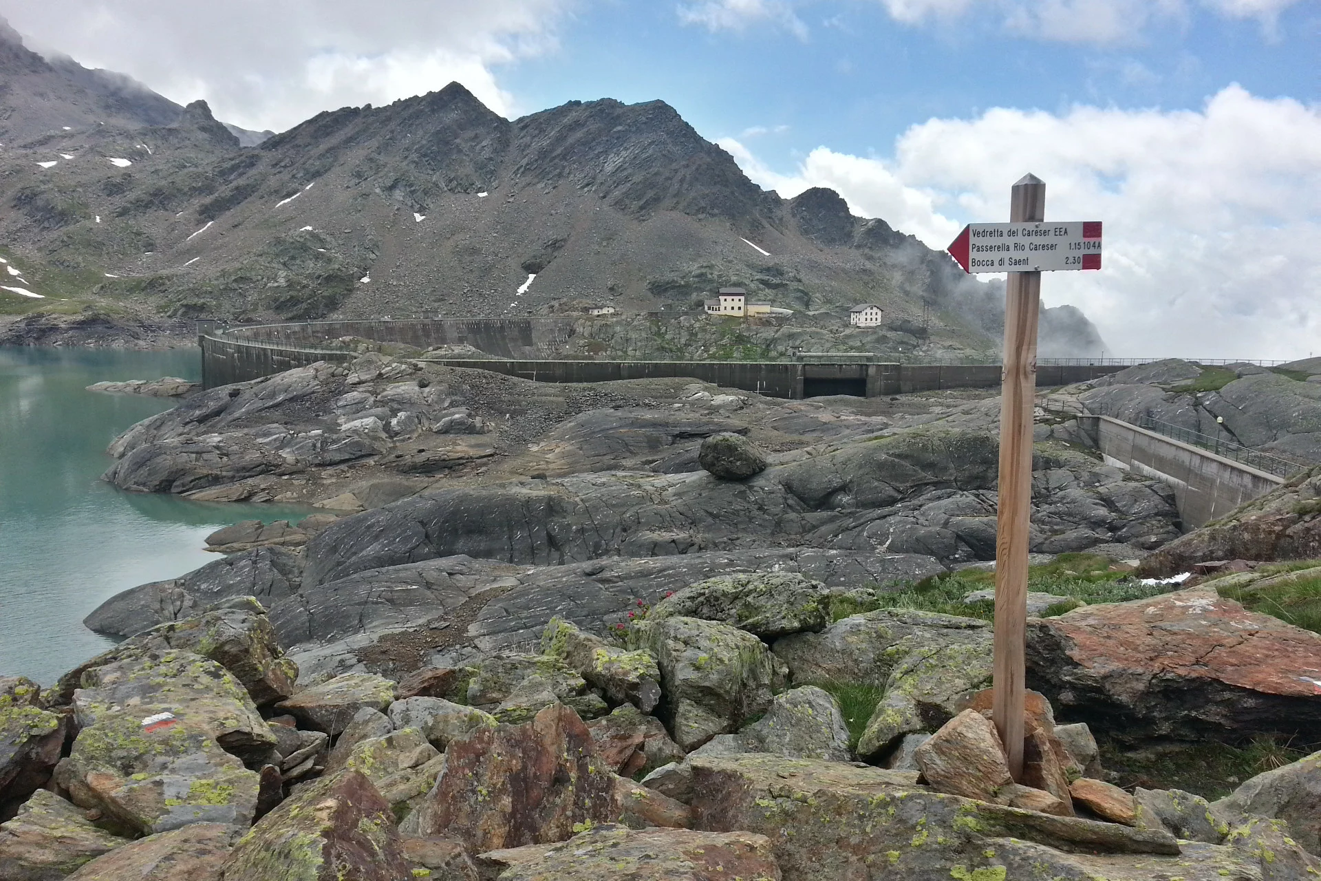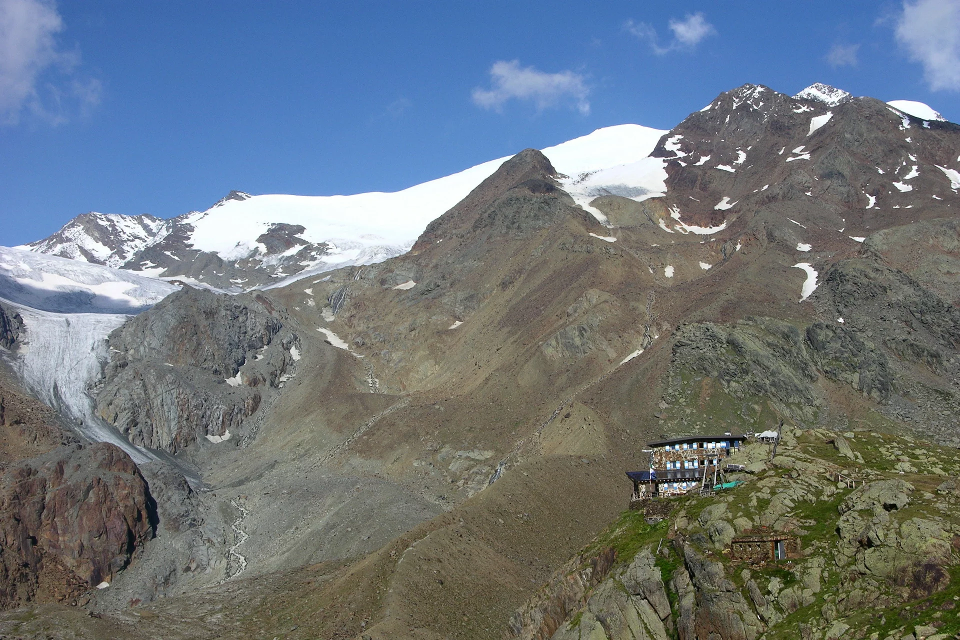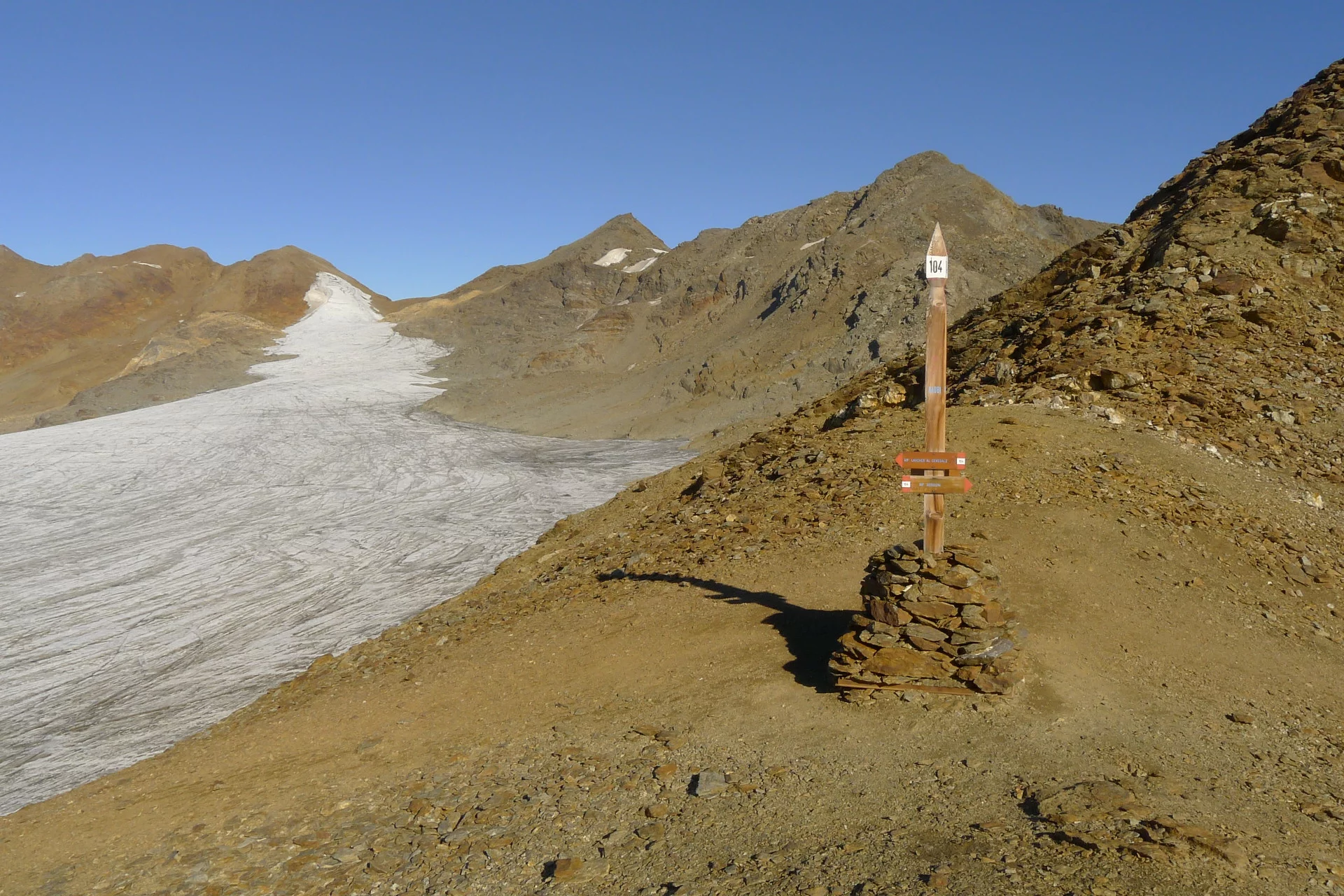 From the Saènt Hut «S. Dorigoni», following first SAT trail 101 and then SAT trail 104 near a junction close to the bridge, you reach Bocca di Saènt (3,121 m), where a 4 m high larch pole has been placed for orientation in case of fog. From here opens the spectacular view of the Careser Glacier, the Venezie Peaks, and Cima Rossa. The crossing to Cevedale Hut is the natural connection between the upper Val di Peio (Val de la Mare) and the upper Val di Rabbi (Val di Saènt). Due to the rapid retreat of the Careser Glacier, a new route has been traced crossing its easternmost area. The glacier section is about 1 km long and not steep enough to risk slipping. From Bocca di Saènt you cross flat terrain keeping about 500 m to the right (north) of the rocky ridge that connects Cima Careser to Cima Campisol and, always walking parallel to this ridge, you reach the glacier's end where a large wooden pole identical to that at Bocca di Saènt is located. From here starts again SAT trail 104, marked with white and red signs, leading to the Cevedale Hut «G. Larcher» (2,608 m).