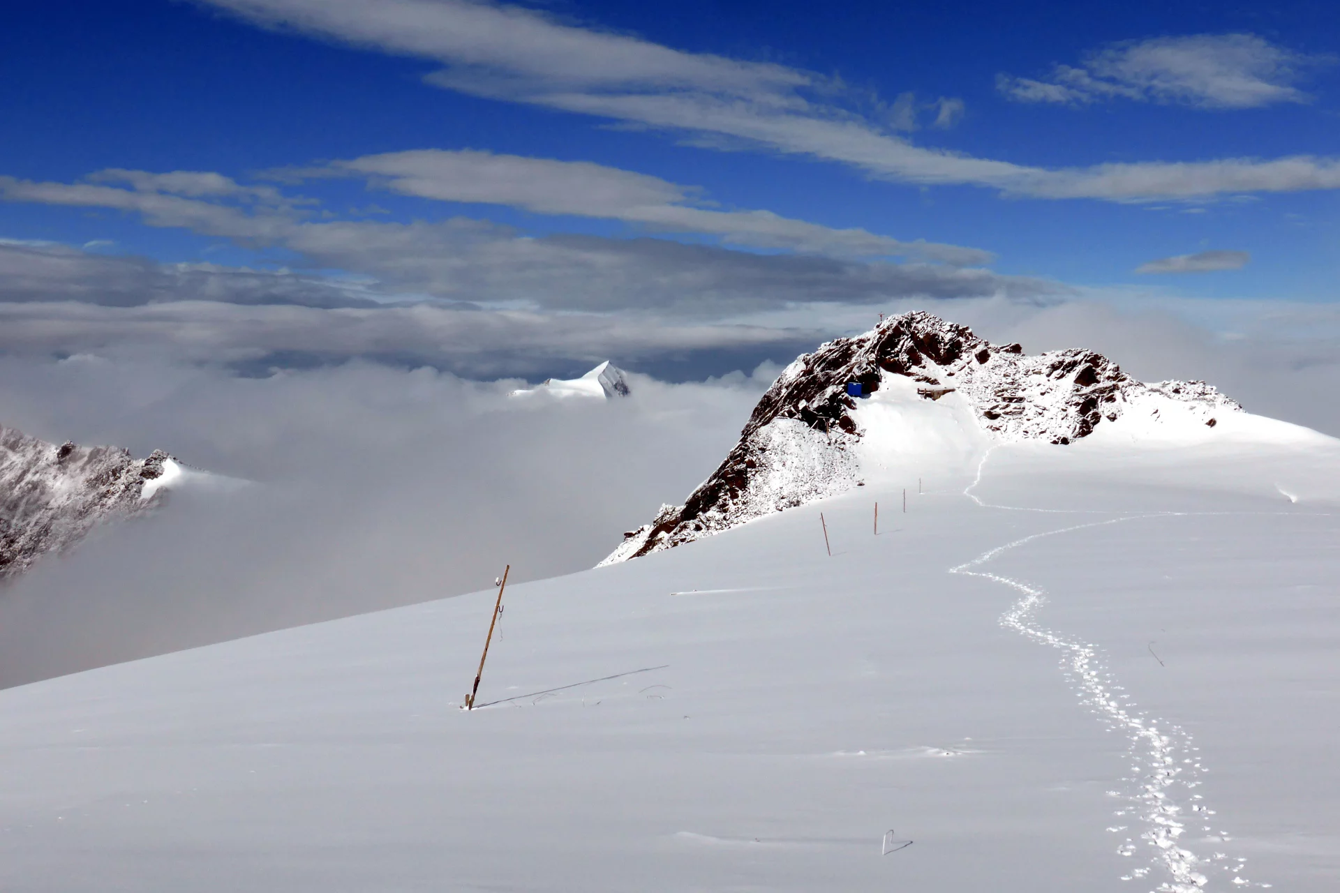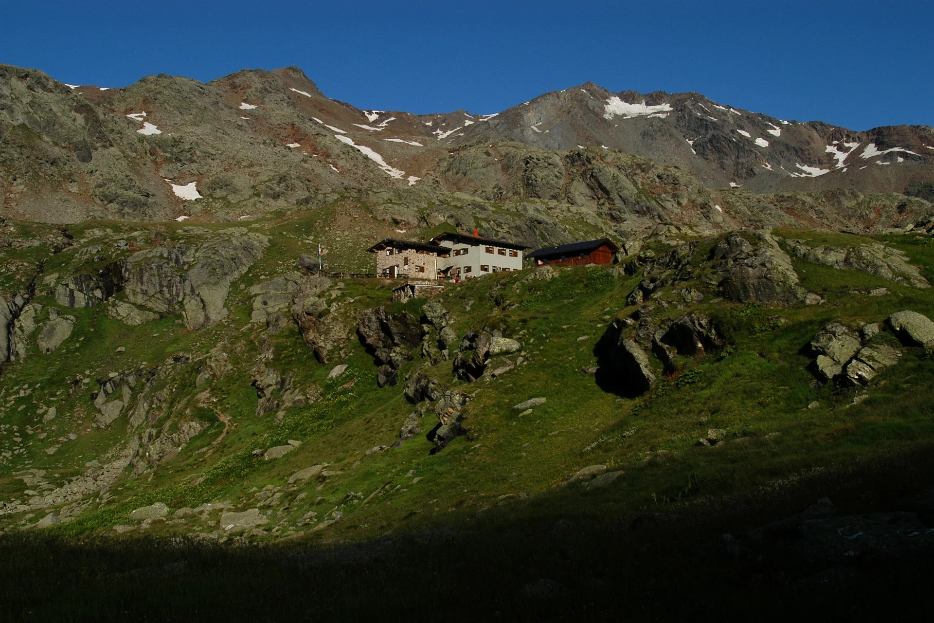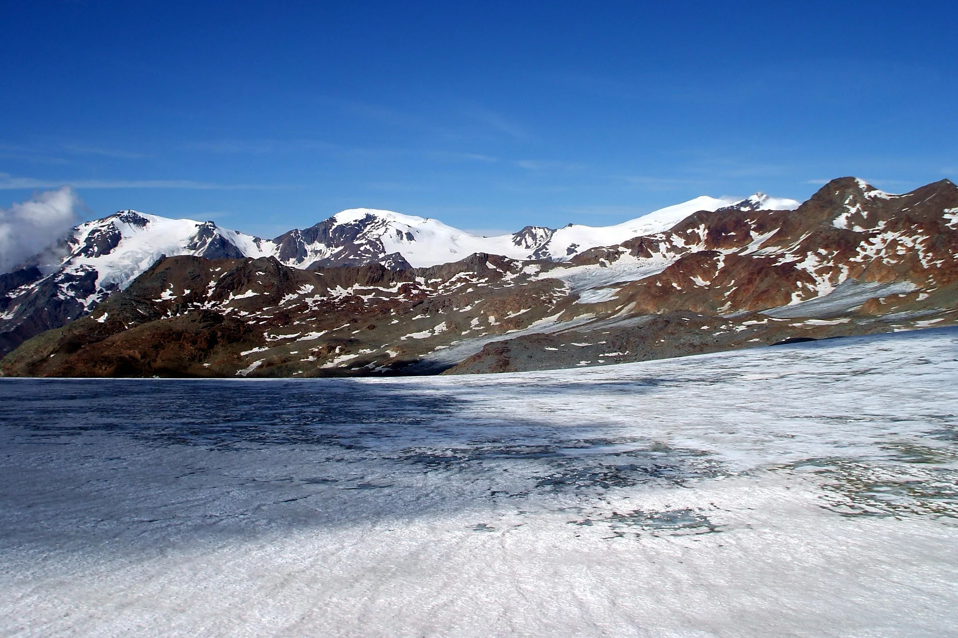 From the Saènt Hut «S. Dorigoni», following first SAT trail 101 and then SAT trail 104 near a junction close to the bridge, you reach Bocca di Saènt (3,121 m), where a 4 m high larch pole has been placed for orientation in case of fog. From here opens the spectacular view of the Careser Glacier, the Venezie Peaks, and Cima Rossa. The crossing to Cevedale Hut is the natural connection between the upper Val di Peio (Val de la Mare) and the upper Val di Rabbi (Val di Saènt). Due to the rapid retreat of the Careser Glacier, a new route has been traced crossing its easternmost area. The glacier section is about 1 km long and not steep enough to risk slipping. From Bocca di Saènt you cross flat terrain keeping about 500 m to the right (north) of the rocky ridge that connects Cima Careser to Cima Campisol and, always walking parallel to this ridge, you reach the glacier's end where a large wooden pole identical to that at Bocca di Saènt is located. From here starts again SAT trail 104, marked with white and red signs, leading to the Cevedale Hut «G. Larcher» (2,608 m).