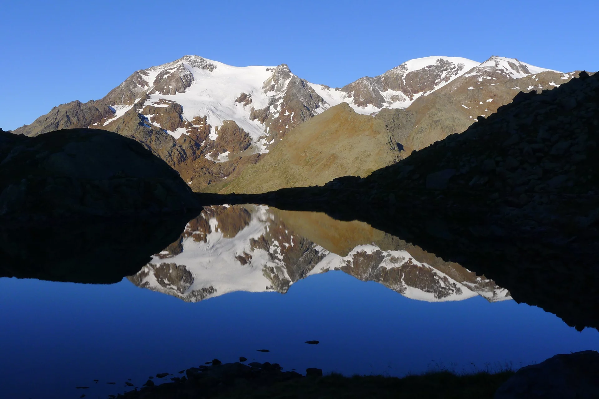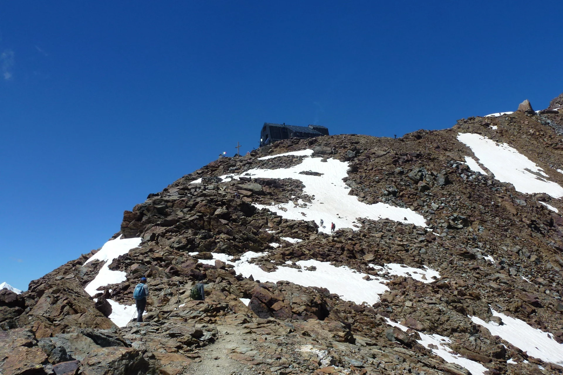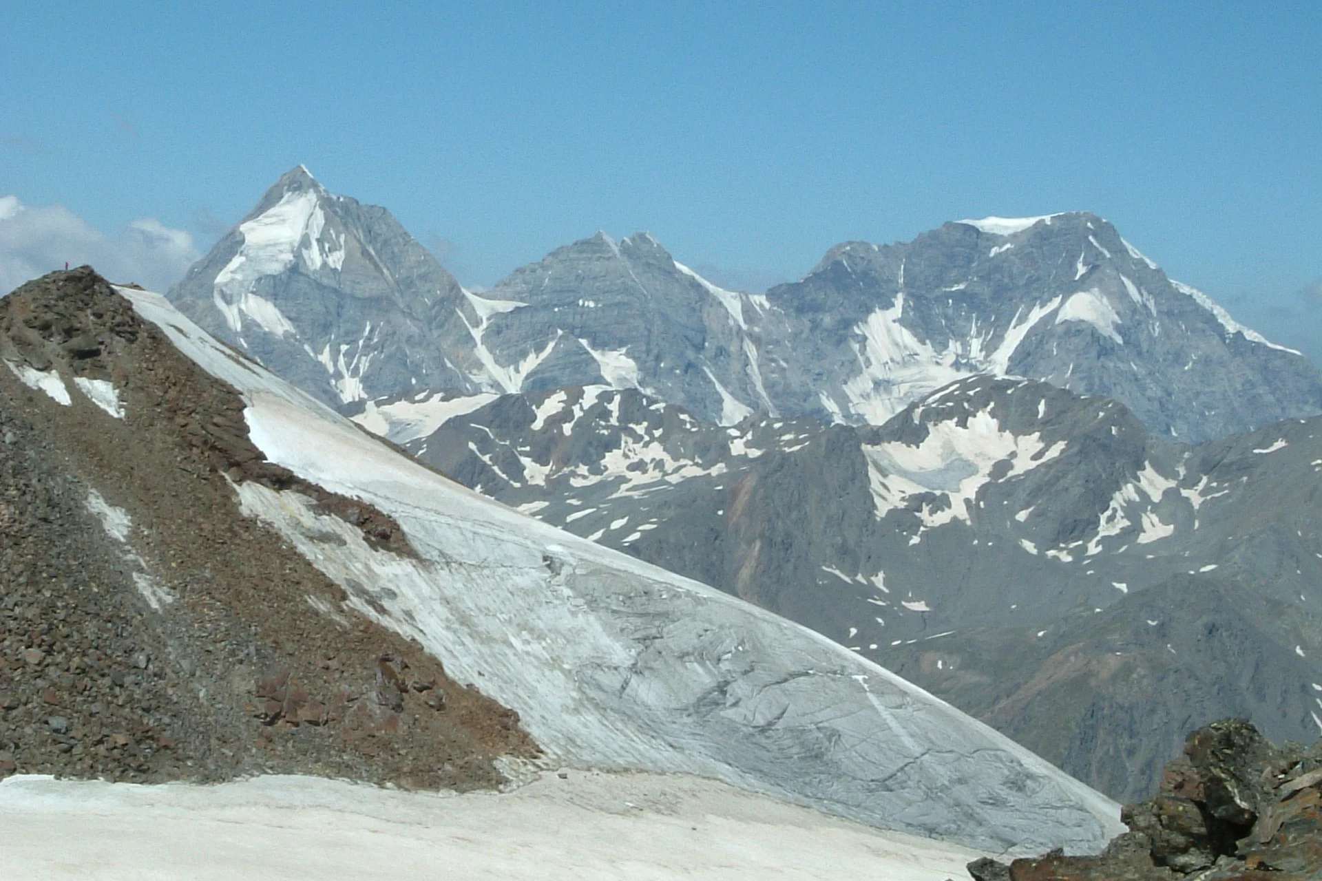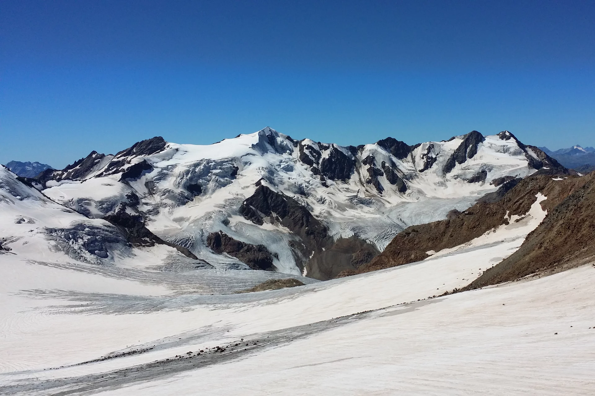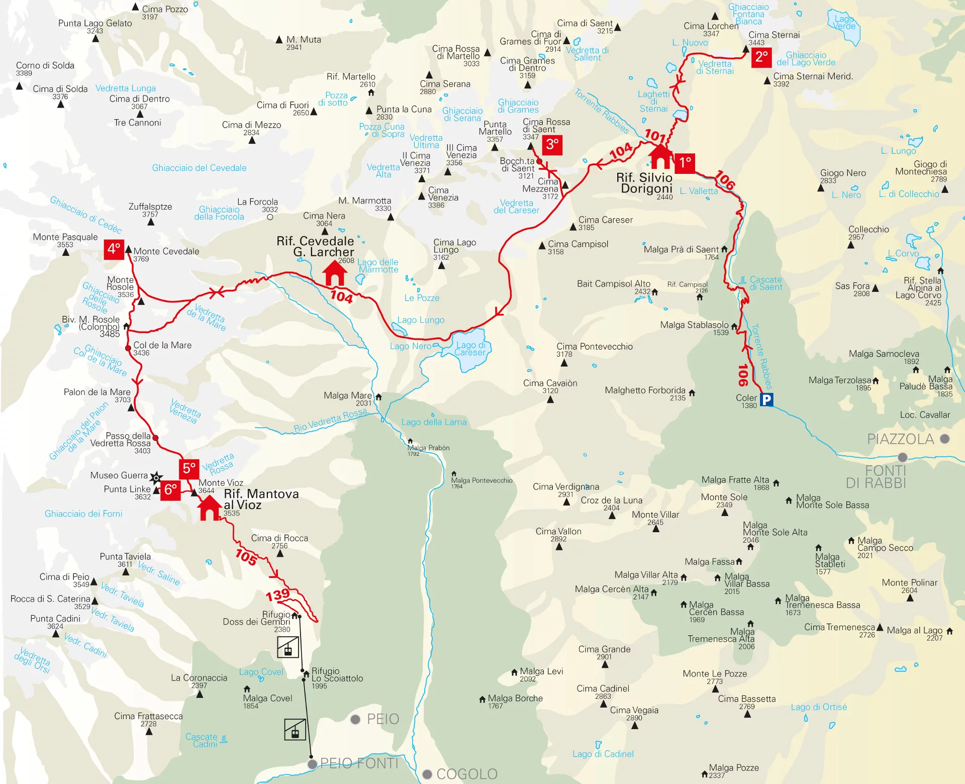 From the Cevedale Hut «G. Larcher», follow SAT trail 103 descending slightly to a junction indicating «Glacier route», take the glacier route that climbs along a moraine until reaching the De la Mare Glacier. Now follow the glacier towards Col de la Mare, where just before the pass turn left overcoming a first steep stretch, following the ridge leading to Palon de la Mare (3,703 m). Descending follow the ridge first snowy then rocky leading to Passo della Vedretta Rossa (3,403 m), then ascending over the Forni Glacier you reach Monte Vioz (3,645 m) from where you descend to the Vioz Mantova Hut (3,535 m).