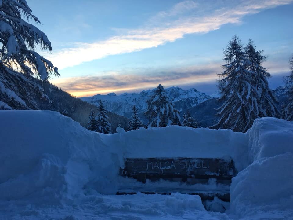 Leave the car in the parking lot near the small church, go a little higher than the village to take the road signposted with direction Alpe Pozze. After passing the village, the trail rises to the right, next to a characteristic farmhouse located to the right of the first curve. At this point you will enter the forest and the path will become significantly steeper, flanking the stream from above, then it will make you turn left onto a small road immersed in a dense fir forest, where the green of the needles will stand out on the white of the surrounding landscape. Continue further and gradually the forest will thin out, until it offers you a spectacular view of the upper Val di Sole and the snow-covered peaks of the Presanella. Stop and enjoy the breadth of this panorama.
