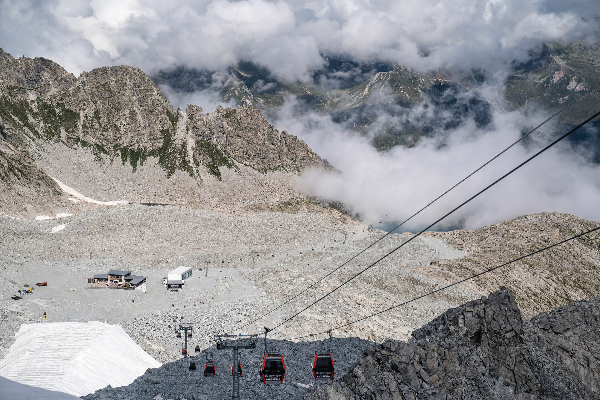 Coming into view of the head of the valley, we notice ahead the remains of an Austrian military village, overwhelmed by a terrible avalanche on the night of Saint Lucia in 1916. With a series of hairpins, we pass a scree field until we reach the head of the valley, near the military ruins. From there, contouring, we arrive on a comfortable flat trail at Passo Paradiso (2575 m), characterized by the Monticello small lakes and the imposing cable car. Near the latter is a former military tunnel, now used as an interactive museum of the White War. In front stands Passo Presena, with what remains of its glacier, covered by protective tarpaulins to delay melting (thus allowing skiing). From here, to continue, there are several options: the via ferrata Sentiero dei Fiori, which runs along the Lagoscuro ridge, or the cable car leading up to Passo Presena, if the Sentiero dei Fiori is beyond one’s capabilities, or in case of bad weather or residual snowfields.