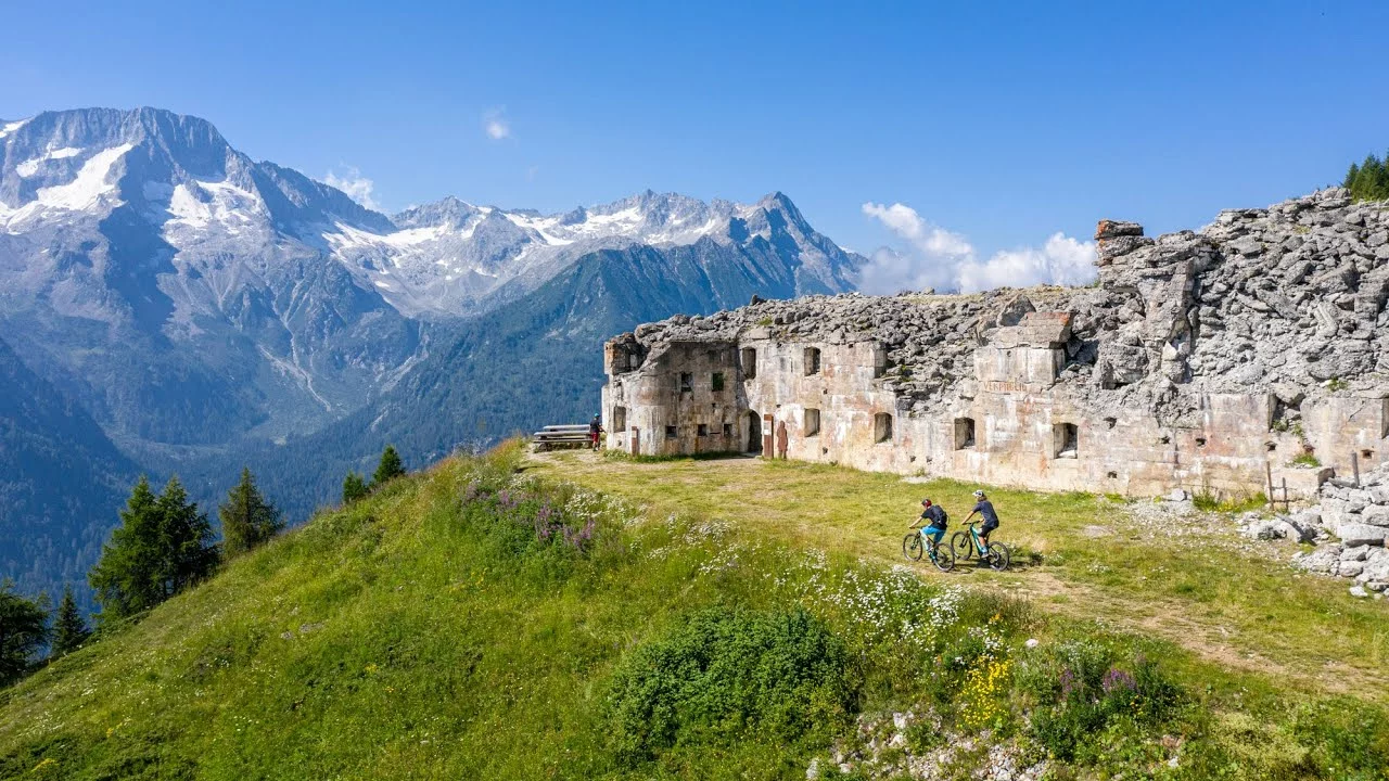 Follow SS. N. 42 for about a hundred meters to the Adamello Ski ticket office on the opposite side of the road; from here, take a path, in some stretches quite steep, towards Malga Cadì - Ospizio San Bartolomeo (1,971 m - the hospice, possibly built as early as 1127 and managed by a Prior, offered hospitality and shelter to passersby) crossing the bike park and then again flat towards Val di Sole across high mountain meadows facing the imposing icy peaks of Presanella. Descending slightly, you reach the ruins of the former Forte Mero (1,841 m - equipped area), surrounded by a beautiful larch forest, which, together with Forts Tonale, Strino, Zaccarana and Pozzi Alti (built between the late 1800s and early 1900s), formed the defense belt of the Austro-Hungarian Empire, with numerous cannons, mortars, and machine guns. The road continues with some ups and downs to a fork from where, on the left, you can climb to former Forte Zaccarana (2,026 m - about 40 minutes) situated dominantly on the slopes of Mount Tonale Orientale. Descend continuing beyond the fork entering Strino Valley after a slight descent until intersecting a valley-bottom path leading to Malga Strino. The route continues slightly uphill for a short stretch to a fork that, taken right, leads to Masi di Strino - Malga Mezzolo, after crossing the Rio Strino following the slopes of the mountain. This is a very panoramic site where you can observe, on the opposite slope, the Adamello-Presanella ridge. At the end of the forest road, you can admire a glimpse of Val di Sole before entering a slightly steep and quite demanding trail to reach Val Verniana. Cross the stream and turn right along the meadows until reaching the homonymous farmhouses; at the last hut, regain the forest road climbing towards Val Saviana and continue on a trail (about 600 meters) that crosses the stream and meadows.