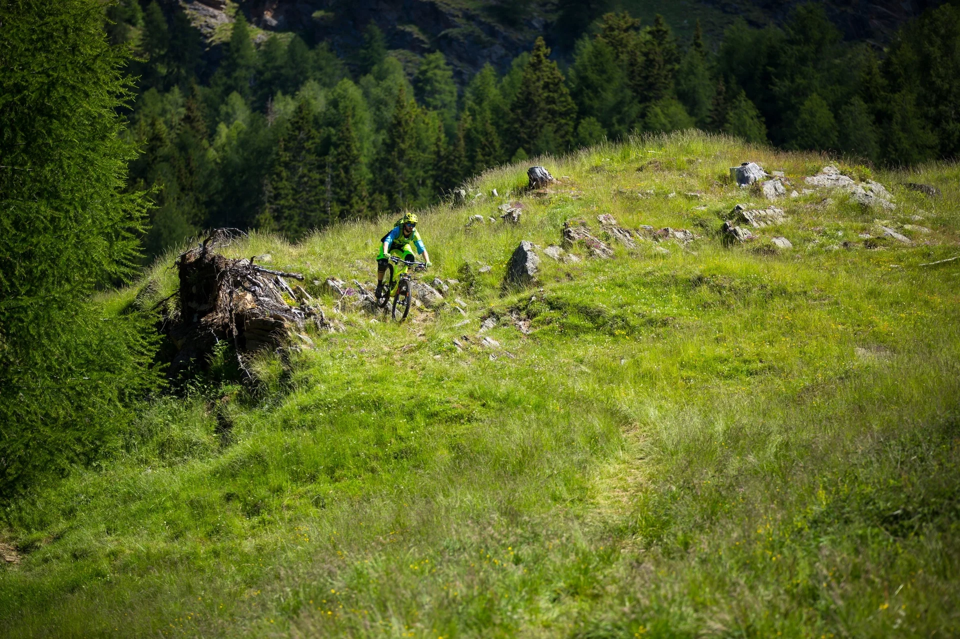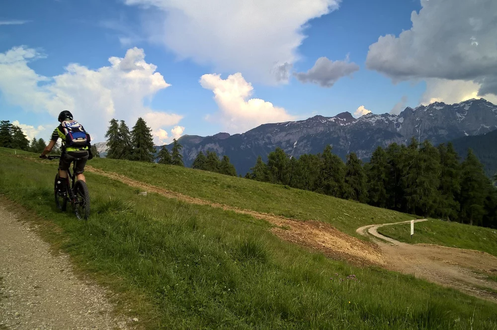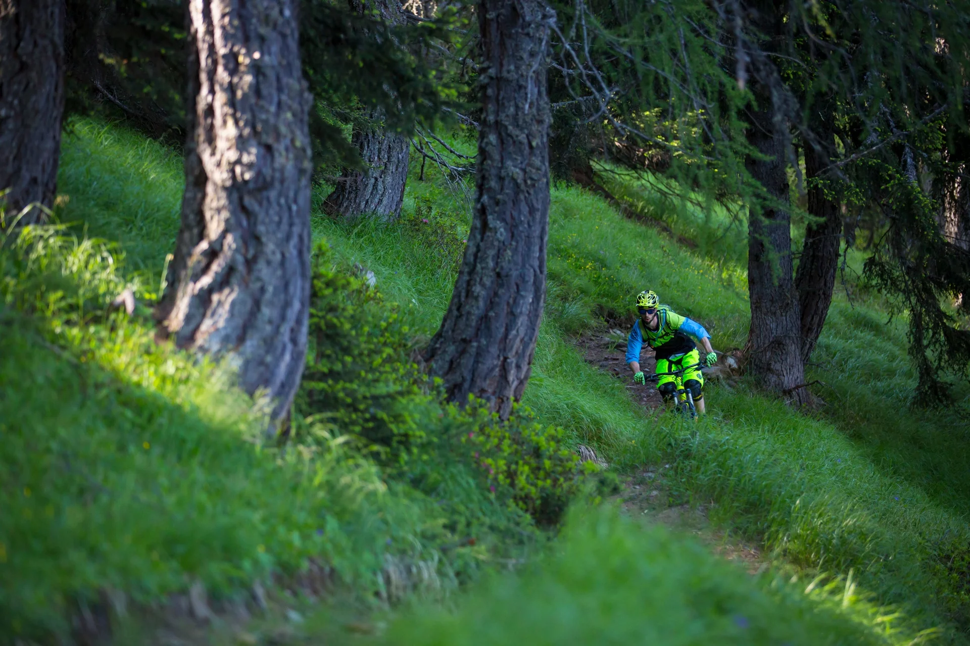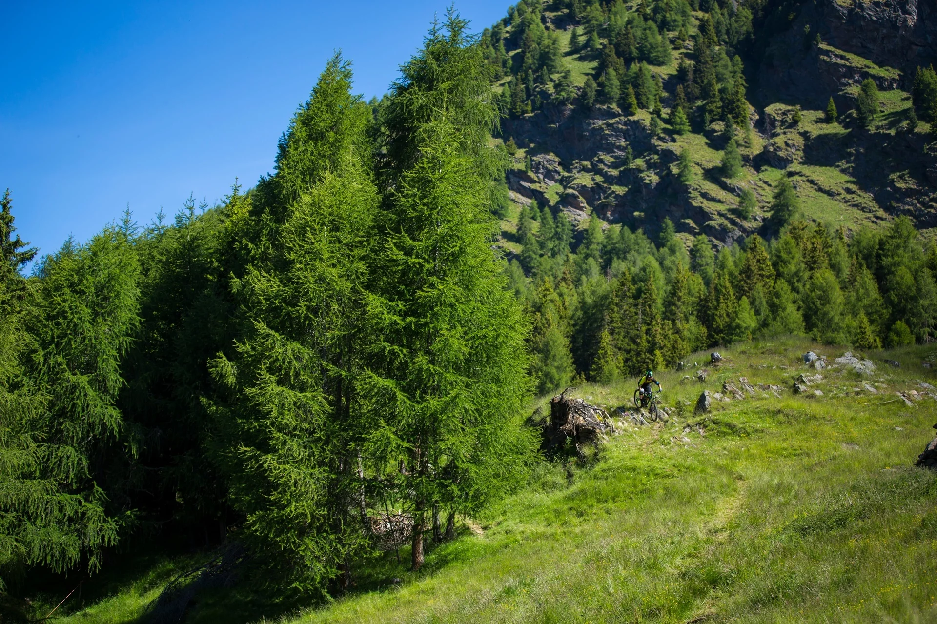 After the village, at a junction take the dirt road on the right which first is flat then climbs to reach Malga del Monte Bassa. Another stretch on dirt road to reach the start of the ancient larches trail. A short push section and follow the trail that runs alongside ancient and majestic larches.
