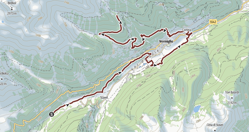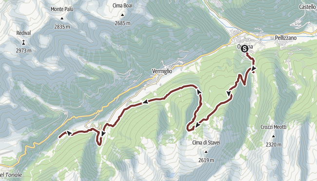 The first part begins on the easy "Sentiero di Valle", following flat meadows along the Vermigliana stream. After crossing Vermiglio, you climb the Strada dei Masi di Verniana, leaving the valley floor for dense conifer forests. The ascent continues until the landscape opens into the wide alpine pastures of Malga Saviana, set in a grassy basin with views of the Adamello-Presanella group.