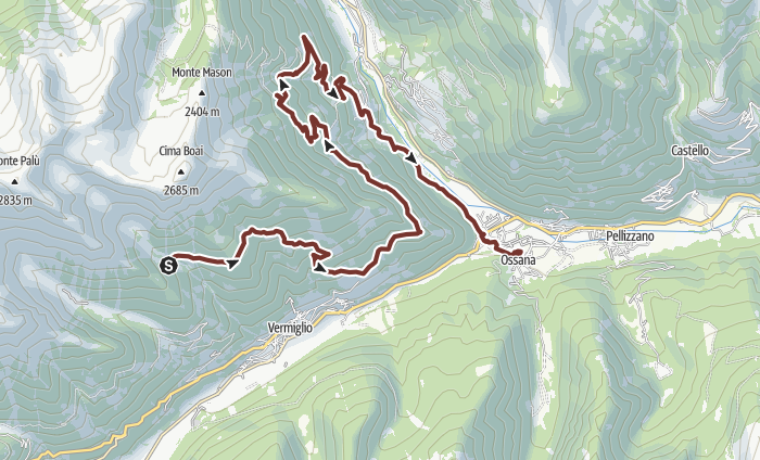 The route begins at the historic San Michele Castle in Ossana and climbs quickly through dense spruce and larch forests to the pastures of Malga del Doss, eventually reaching the wilder alpine basin of Lago di Barco beneath the Presanella peaks. From the lake, the trail descends steeply toward the Vermiglio valley, where the landscape softens into meadows, traditional masi, and the gentle flow of the Vermigliana stream.