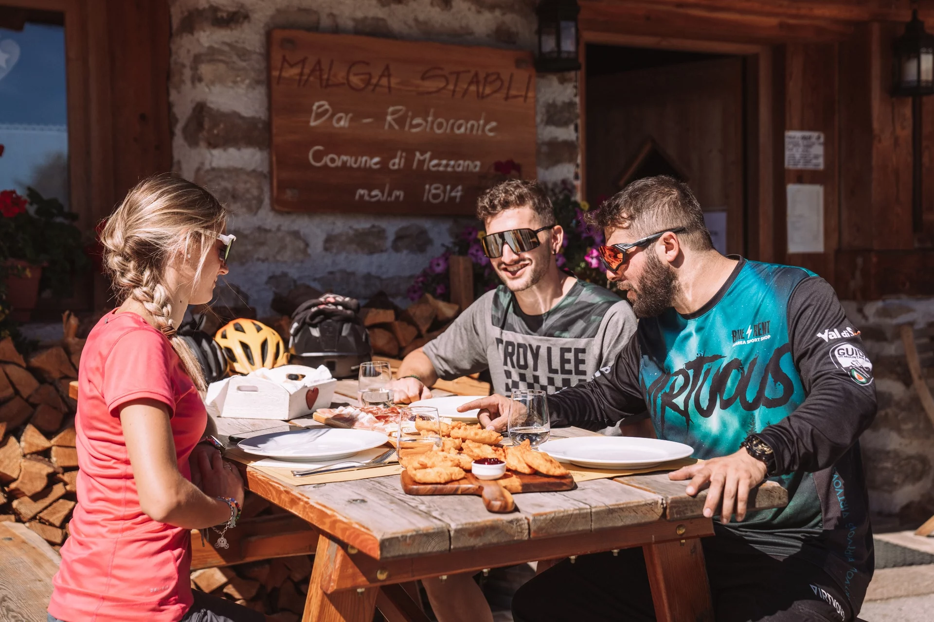 Si attraversa poi la graziosa frazione di Ortisè, tipico paesino di montagna con caratteristiche abitazioni in legno di larice. Una volta raggiunta la graziosa chiesa di San Cristoforo, intraprendi la strada in direzione Malga Stabli dapprima asfaltata e poi sterrata con fondo compatto con pendenza costante e moderata. Tra una pedalata e l'altra, osserva i prati e pascoli che ti circondano oltre che ai fitti boschi di larice che ti daranno un sollievo durante le calde giornate estive e raggiungi Malga Stabli. Qui potrai goderti una piccola pausa per ammirare la spettacolare vista che ti si apre di fronte: dalle maestose Dolomiti di Brenta alla Presanella. Per un gustoso pranzo, la malga offre un menù con piatti fatti con prodotti tipici del territorio oppure se invece preferisci una sosta rapida, non perderti i golosi dolci.