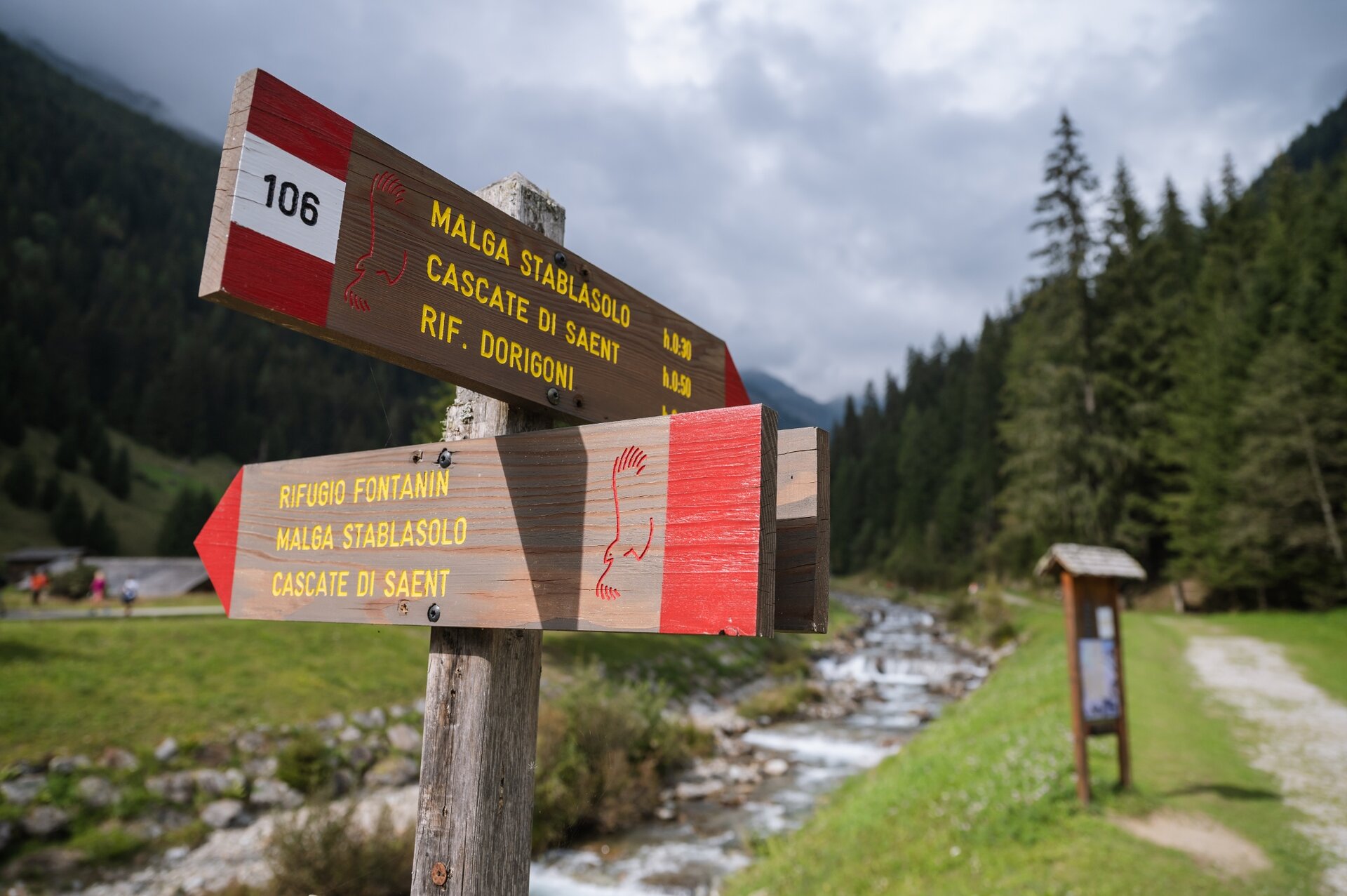 Questo percorso ad anello conduce ad uno dei luoghi più fotografati della Val di Rabbi: le Cascate di Saént.