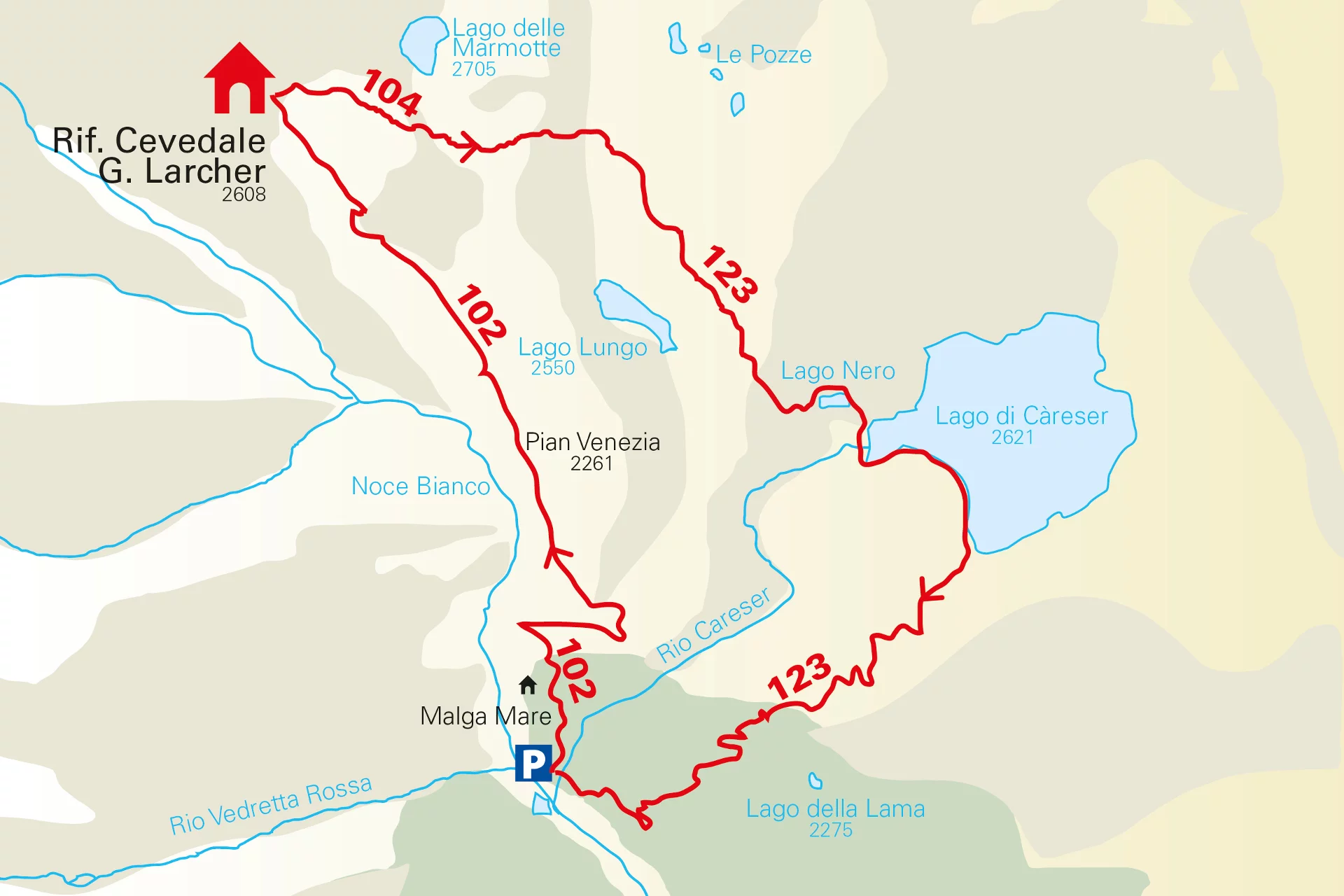 Raggiungi in auto il parcheggio di Prà Bòn da Cogolo di Peio su strada asfaltata. Da qui prendi il sentiero sulla sinistra del parcheggio che in circa 45 minuti ti porterà a Malga Mare 2.301 m e da qui imbocca il sentiero SAT 102, che fiancheggia la malga e poi sale in un bosco di pini cembri fino a Pian Venezia, un pianoro panoramico. Da qui il rifugio è già visibile e la sua vista ti accompagnerà per il resto del tragitto, che continua a mezzacosta sul lato destro della valle fino al Rifugio Cevedale «G. Larcher» (2.608 m slm). Dal rifugio, posto in una posizione ideale per osservare l’ampio e caratteristico ambiente glaciale, puoi seguire il sentiero SAT 104 fino ad un piccolo passo (2.751 m), per poi scendere in un vasto altipiano, dove sono presenti numerosi laghetti di origine glaciale. Da qui arriverai all’incantevole Lago delle Marmotte (2.705 m), che è il punto più alto dell'escursione. Lasciato il lago, seguendo il sentiero SAT 123, percorri un comodo percorso pianeggiante che passa in prossimità del Lago Lungo e raggiunge le sponde del piccolo Lago Nero, poco prima del bacino artificiale del Càreser (2.603 m). Attraversa il lago seguendo il muro della diga fino alle costruzioni degli addetti alla sorveglianza. Da qui il sentiero SAT 123 scende tra macereti con numerosi tornanti. Continuando a zig zag, scenderai in un bel bosco di caratteristici cembri. Con breve deviazione è possibile raggiungere il minuscolo Lago delle Lame (2.275 m). Ritornati sul sentiero, si scende fino al parcheggio di Malga Mare.