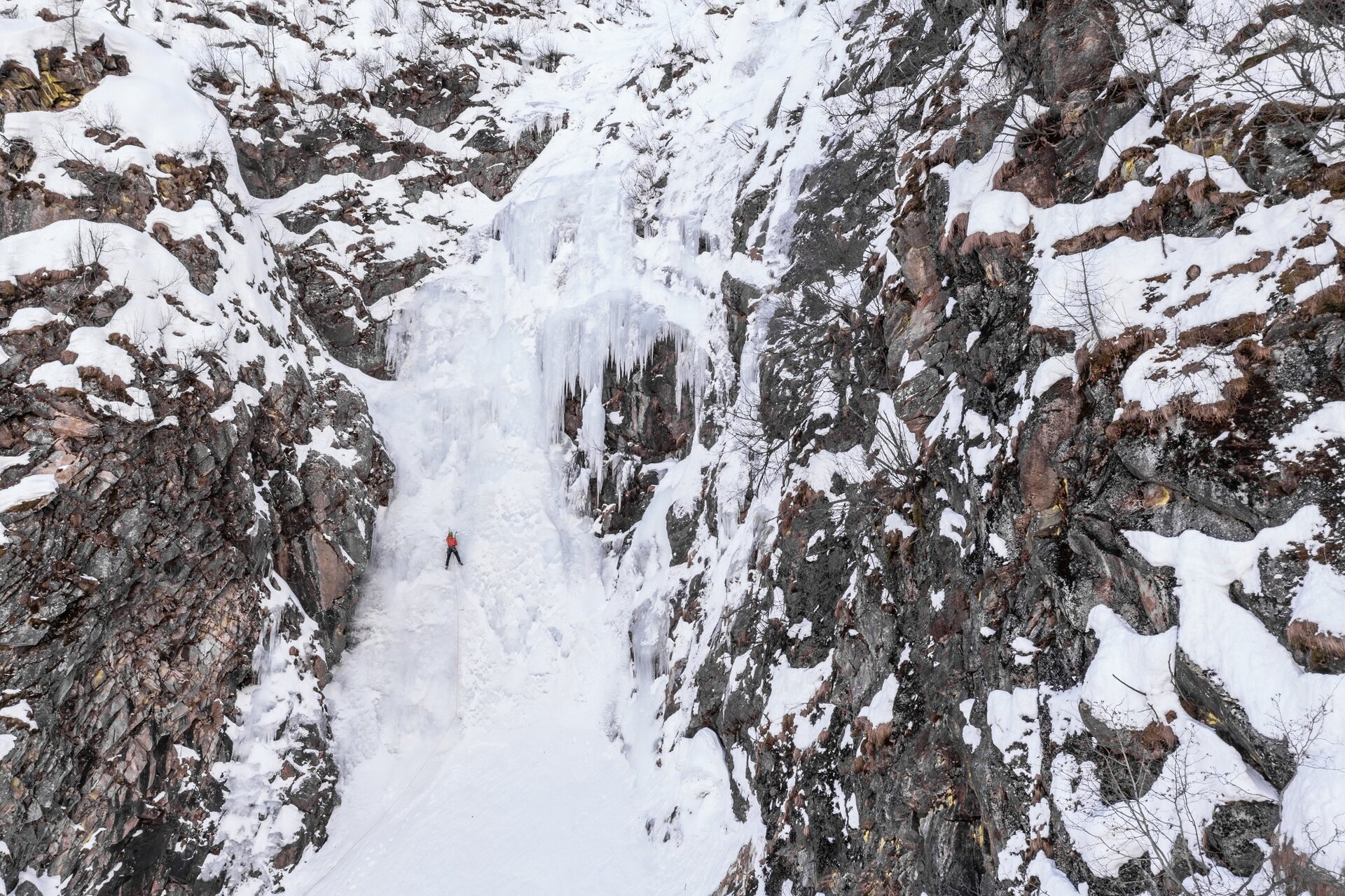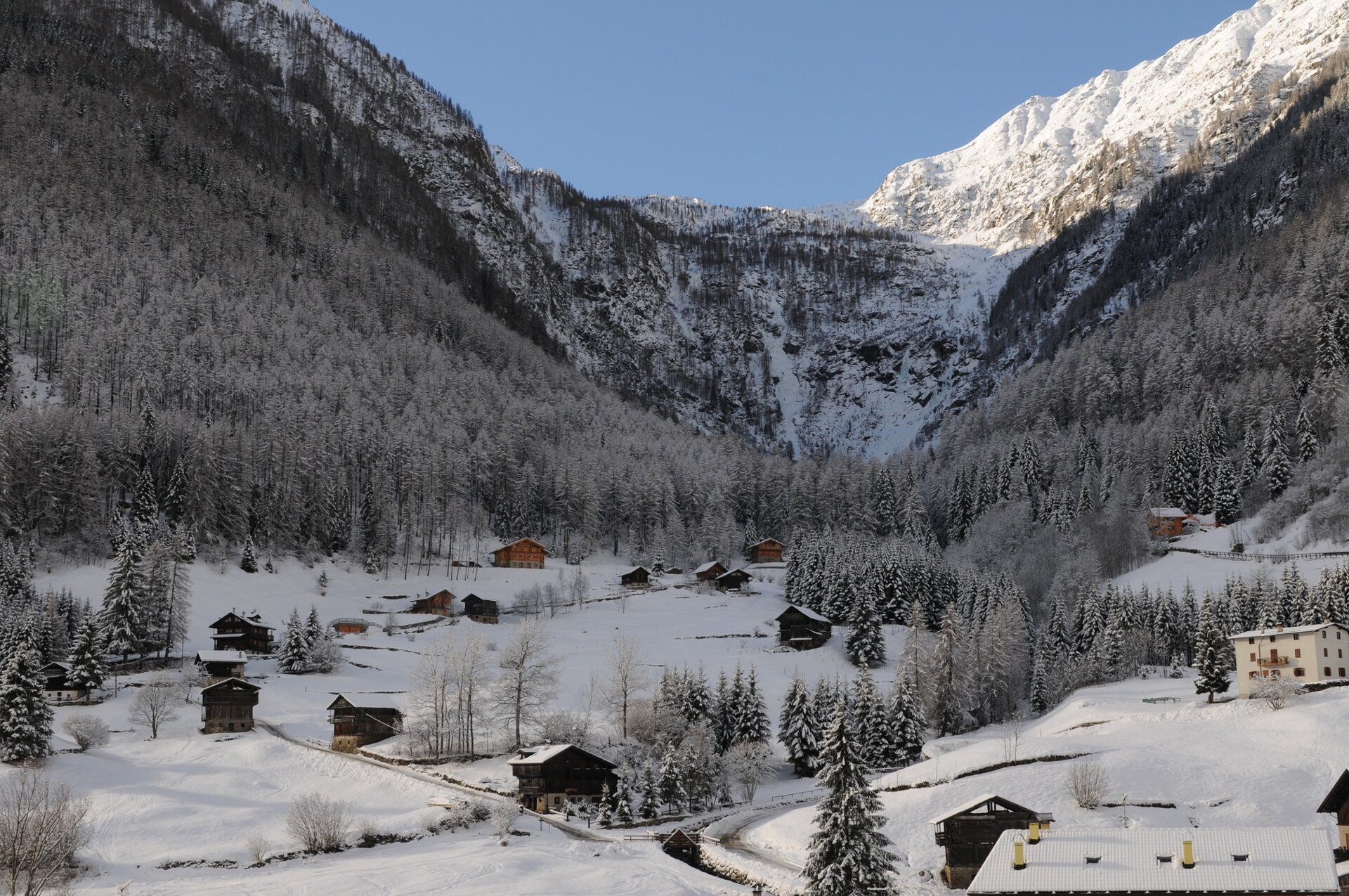 Parcheggiata l'auto, prima di partire per l'escursione, scatta una foto sulla Val Valorz, con i suoi caratteristici masi alpini e, in lontananza, le sue cascate ghiacciate.