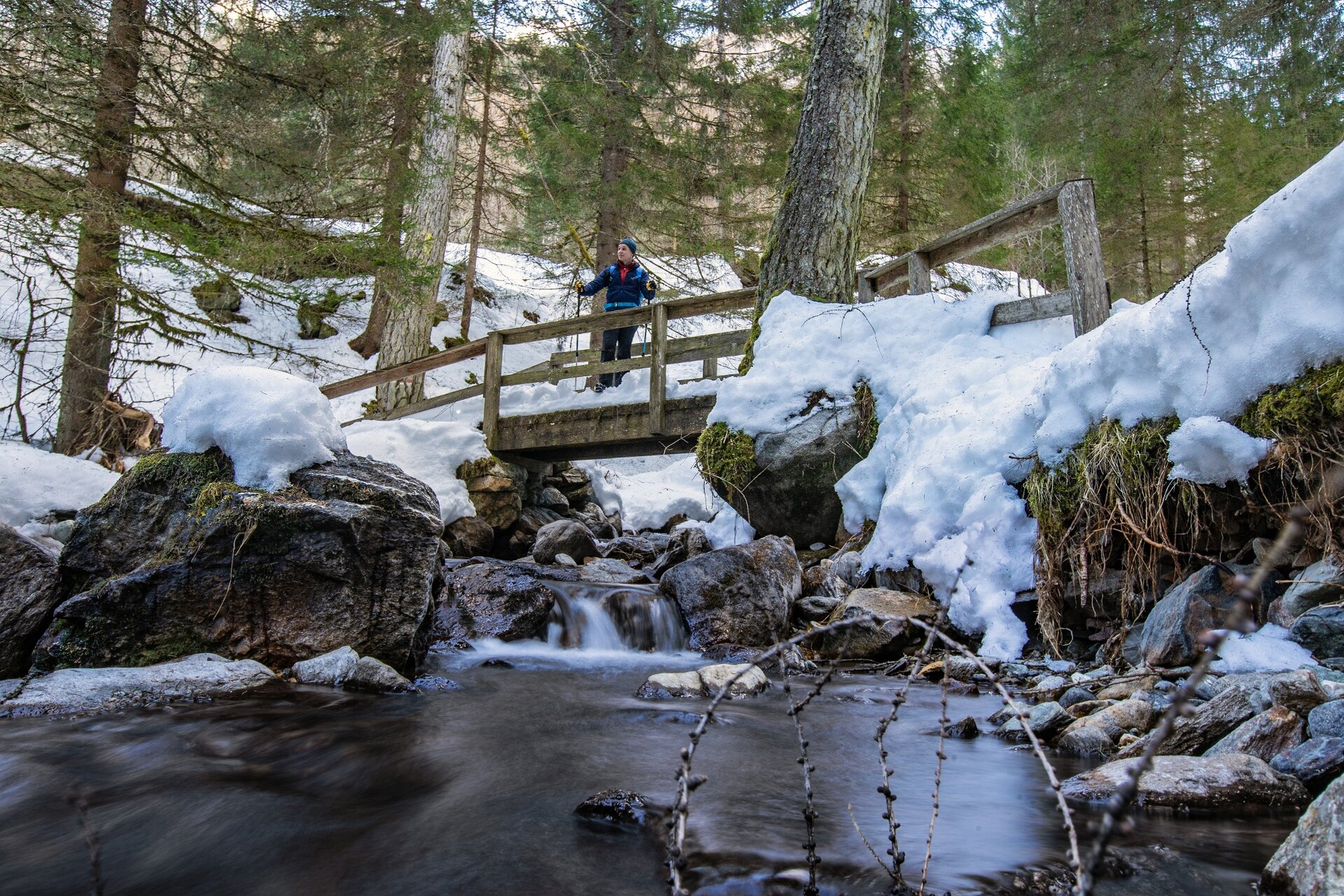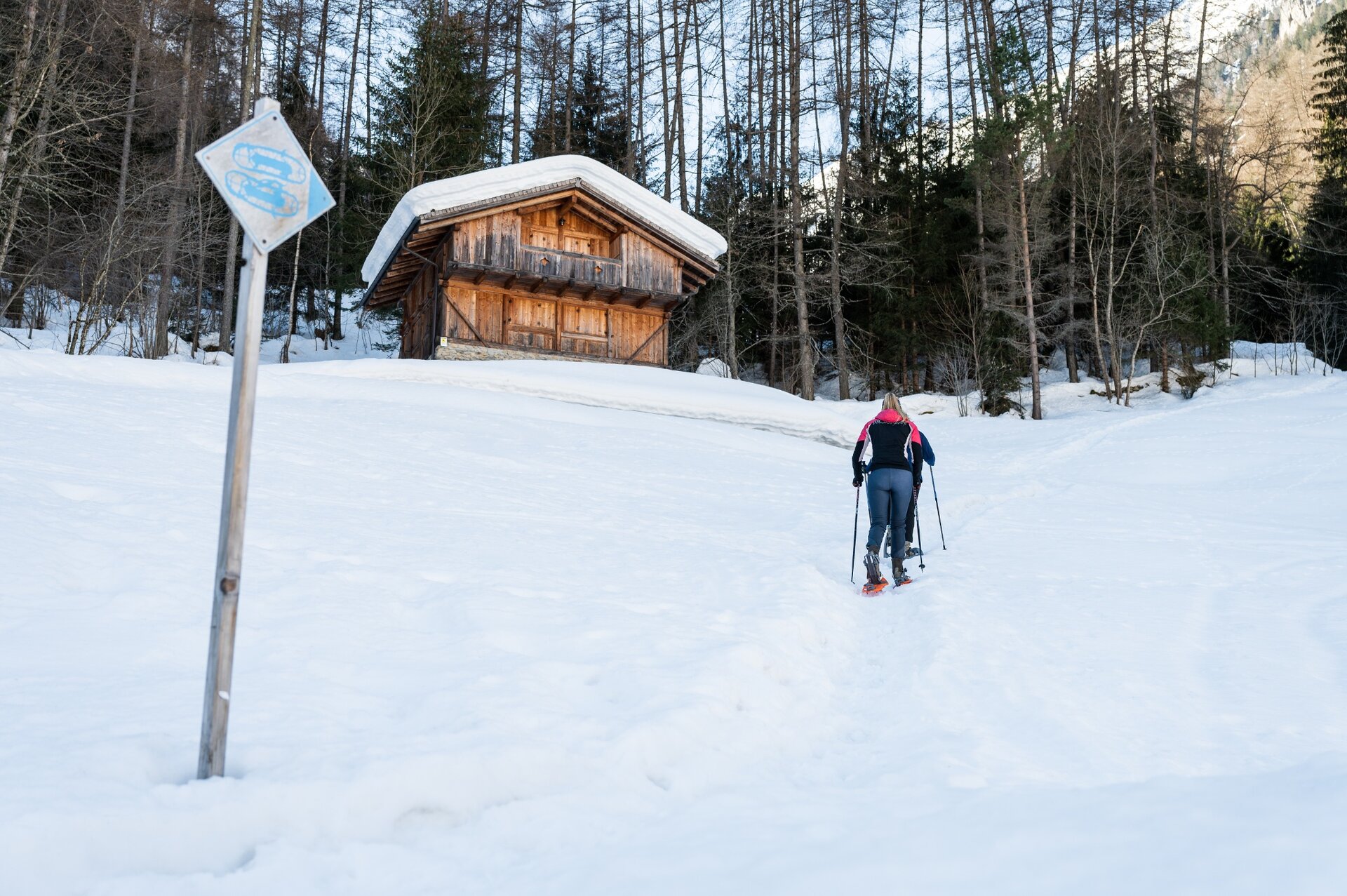 Supera due stalle ed un vecchio maso fino a raggiungere un ponticello sul Rio Valorz, in prossimità del quale puoi indossare le ciaspole.