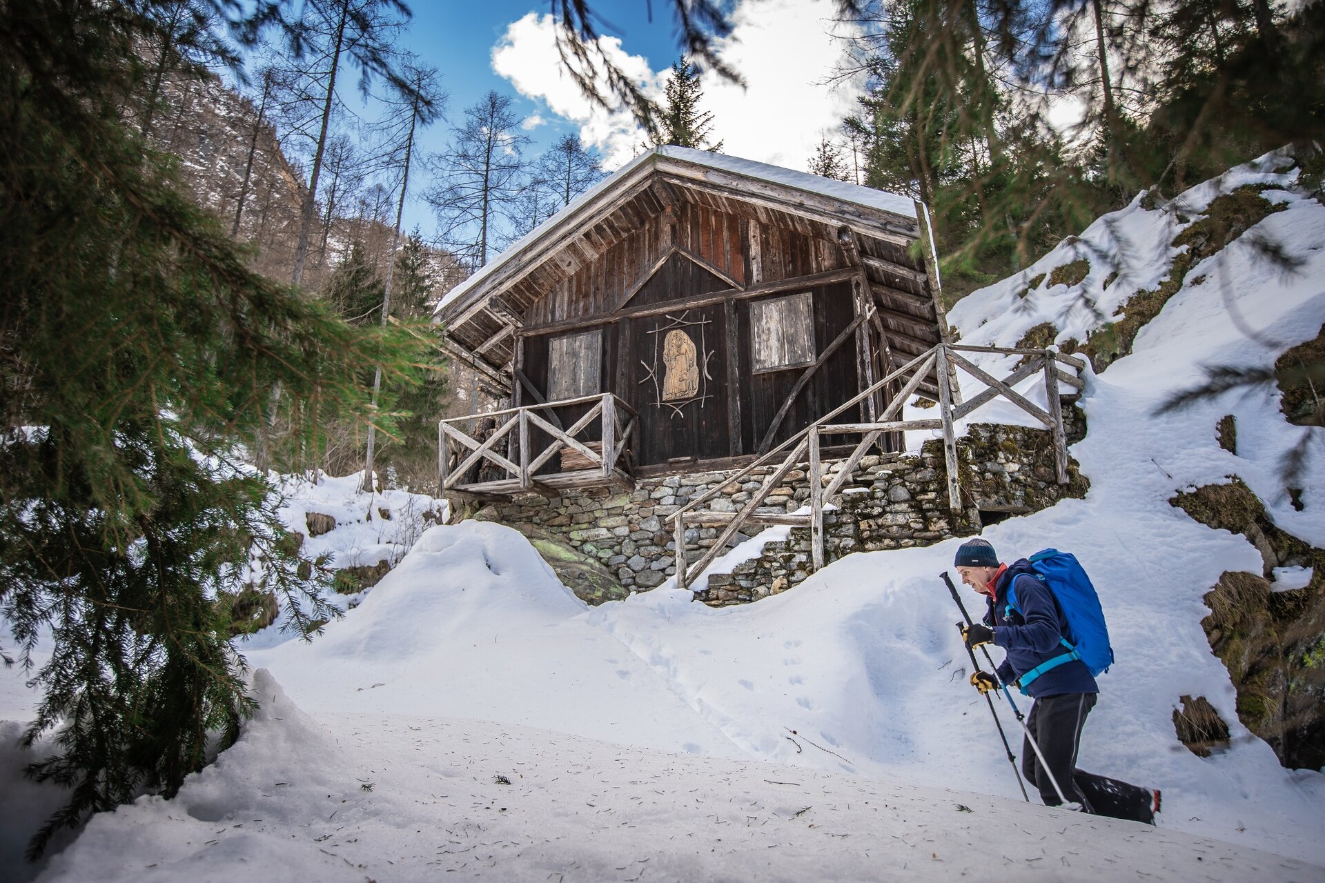Dal parcheggio nei dell’Ufficio Turistico a San Bernardo, tenendo in mano le racchette da neve, scendi lungo la strada e portati al di là del torrente Rabbies.