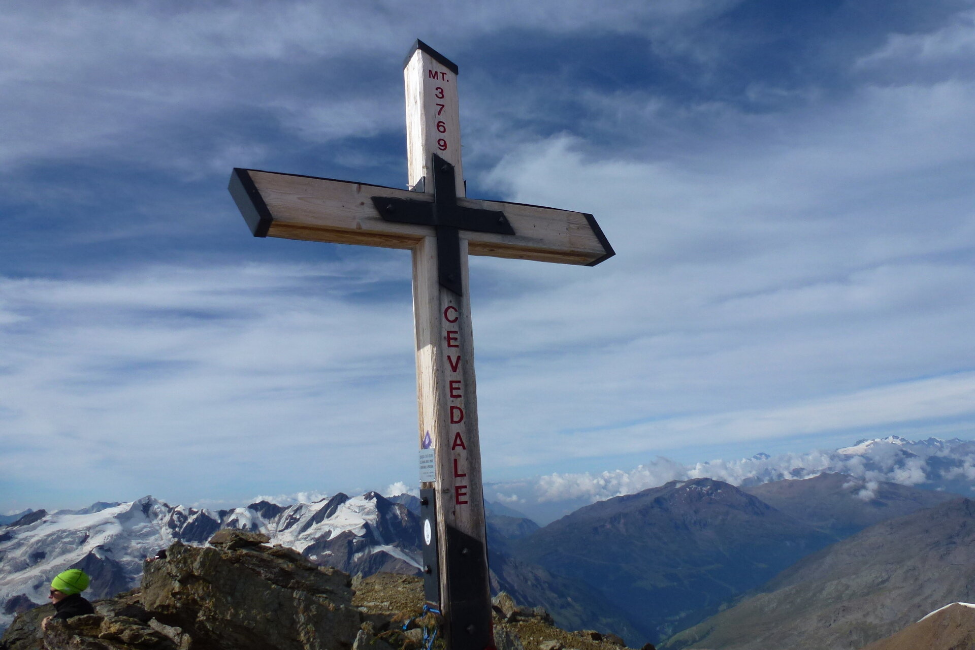 Cevedale offre un panorama immenso: intorno alle vette si possono ammirare i ghiacciai, verso nord-est l'Ortles e il Gran Zebrù, verso sud-ovest il Palon de la Mare e il Monte Vioz.