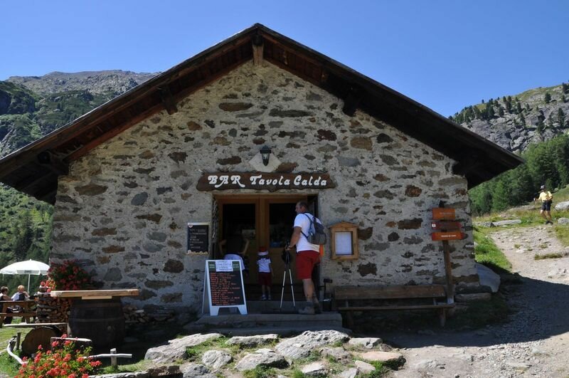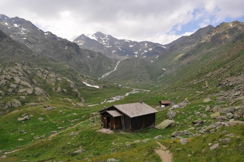 Il panorama sulla Val Venezia e sul Cevedale è splendido. Al Pian Venezia, a fianco della baita, si scorge il sentiero nr. 146 che verrà percorso in discesa al ritorno.