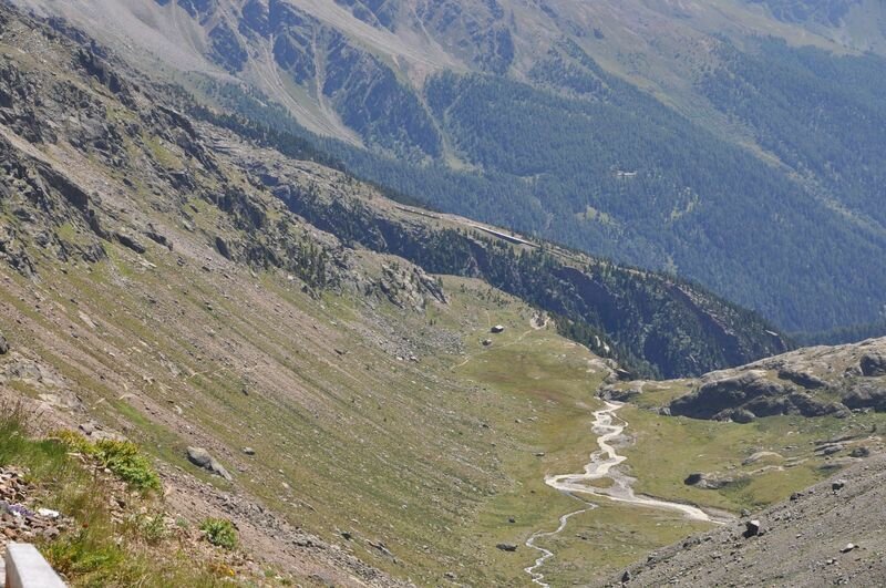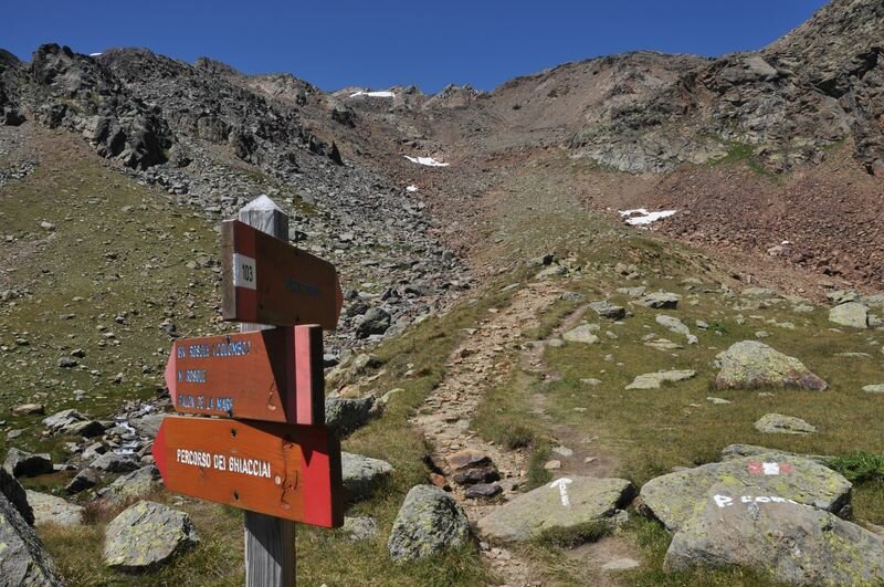 Arrivati al cartello che indica il bivio tra il sentiero 103 e il percorso tra i ghiacciai si gira a destra e ci si inerpica lungo il versante fino ad arrivare, con alcune zeta e tratti ripidi a La Forcola a quota 3032m.