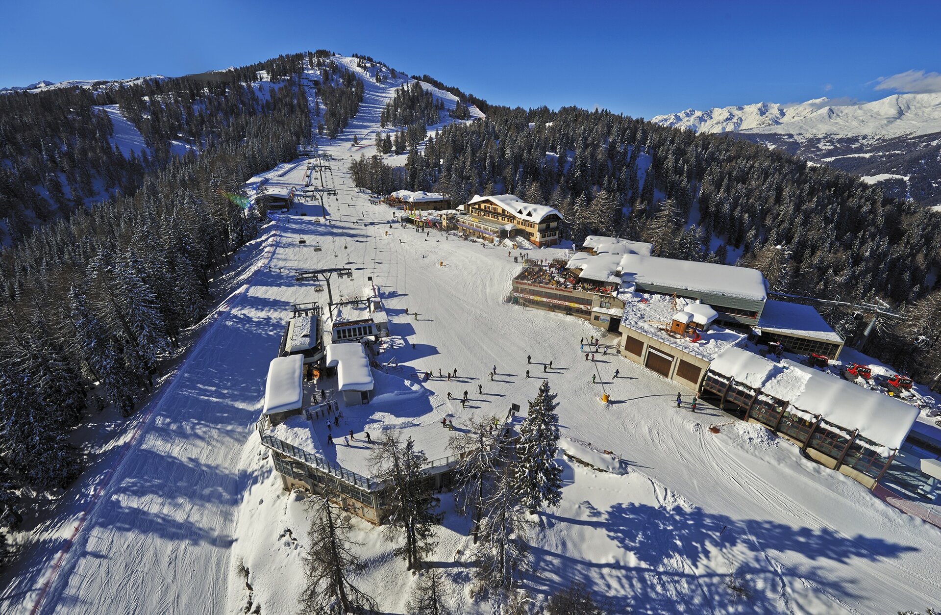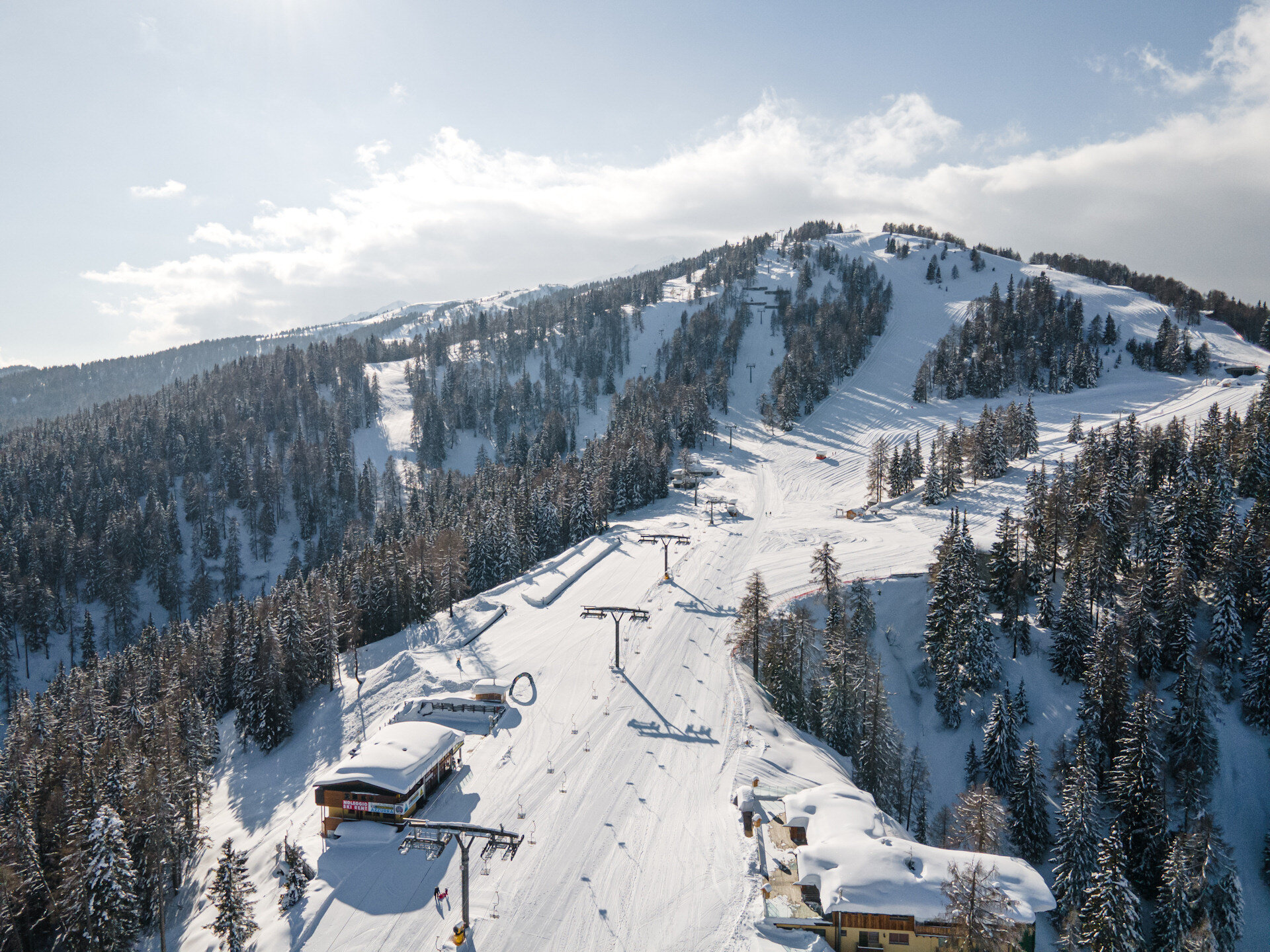 Dalla malga l'itinerario prosegue nel bosco e, attraverso alcuni tornanti, raggiunge il comprensorio sciistico Folgarida Marilleva, all'interno della ski area Campiglio Dolomiti di Brenta Val di Sole Val Rendena, precisamente la località Malghet Aut, crocevia degli sciatori che raggiungono le piste con le telecabine che partono da Folgarida e Folgarida Belvedere. Proprio per la presenza massiccia di sciatori, ti invitiamo a fare molta attenzione. Al Malghet Aut puoi prevedere una sosta nei ristoranti e rifugi della località: il pranzo vista Dolomiti è assicurato!
