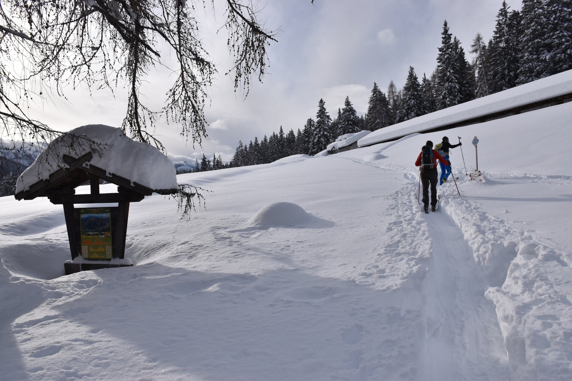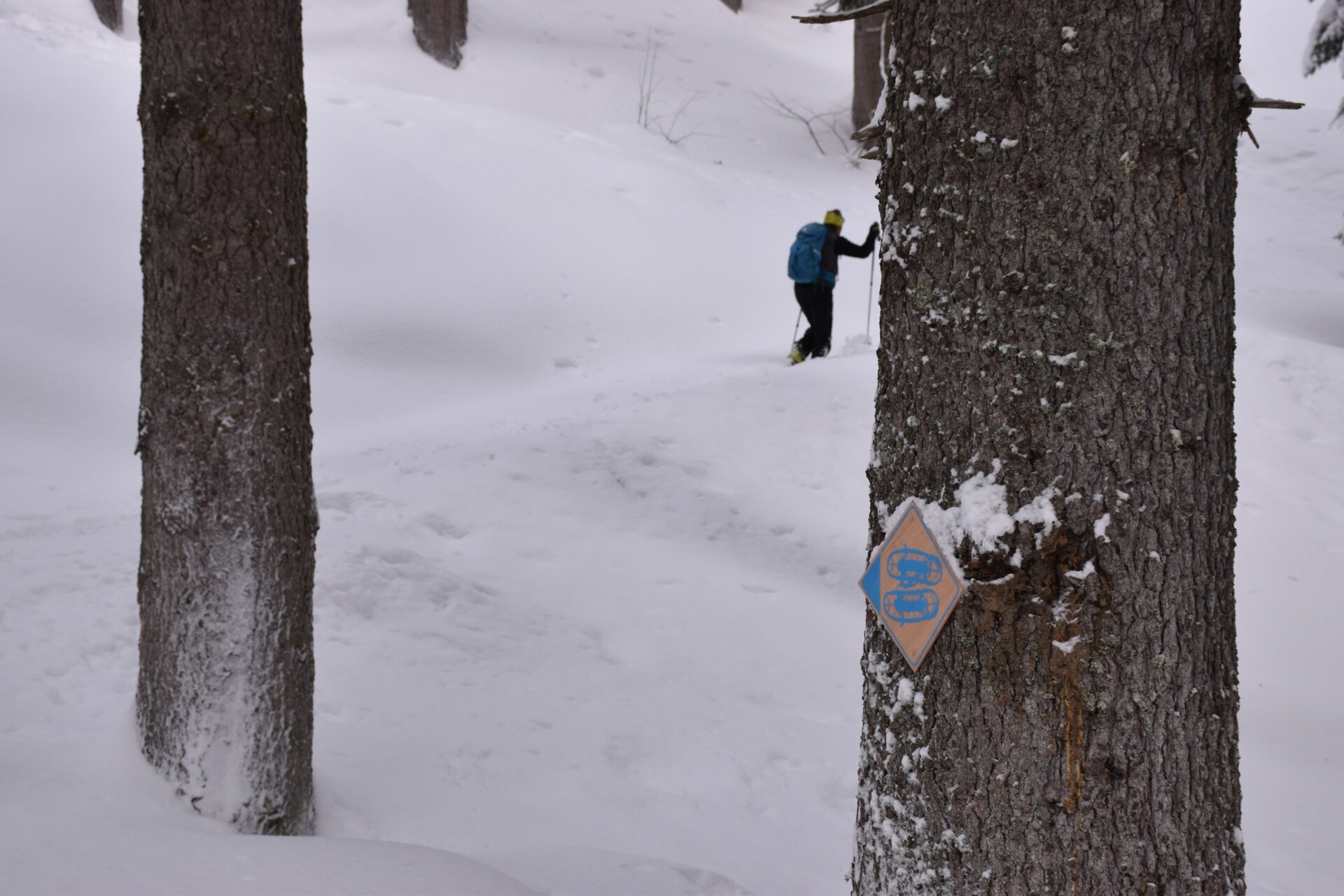 Ciaspolata facile che si sviluppa lungo sentieri tracciati e segnalati da apposita cartellonistica riportante una racchetta da neve.