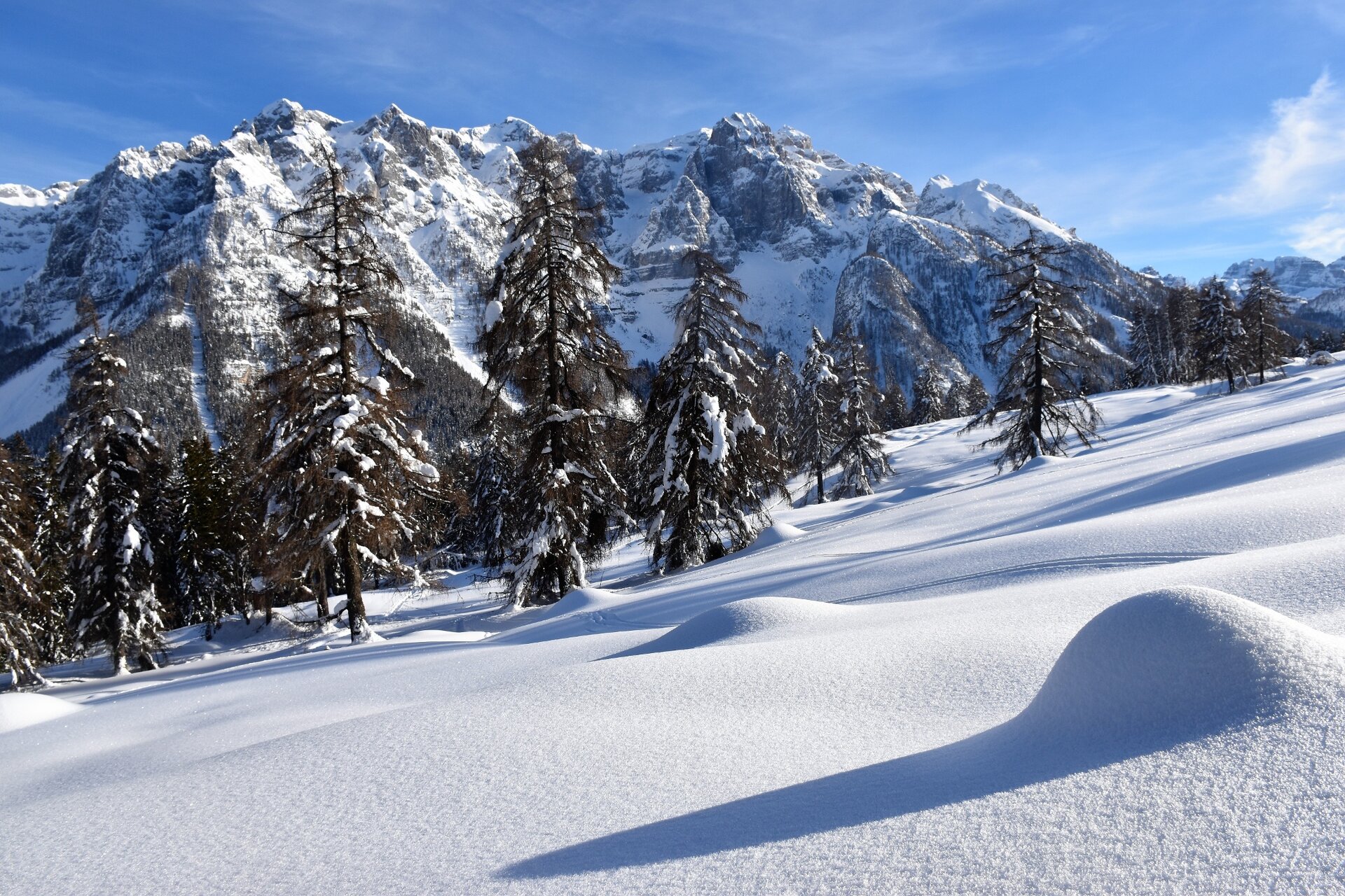 Dalla località di Folgarida prosegui sulla SS 239 in direzione di Madonna di Campiglio. Dopo circa 3 chilometri dalla località Belvedere di Folgarida, all'altezza del bivio che porta a Malga di Dimaro, troverai sulla tua destra un'area sgombra da neve, dove potrai parcheggiare l'auto. Prosegui a piedi lungo la strada forestale, fino a Malga di Dimaro (chiusa in inverno), raggiunta la quale, fai una breve pausa per ammirare lo spettacolare panorama sulle Dolomiti di Brenta, con il Sasso Rosso che primeggia in questa vista da cartolina.
