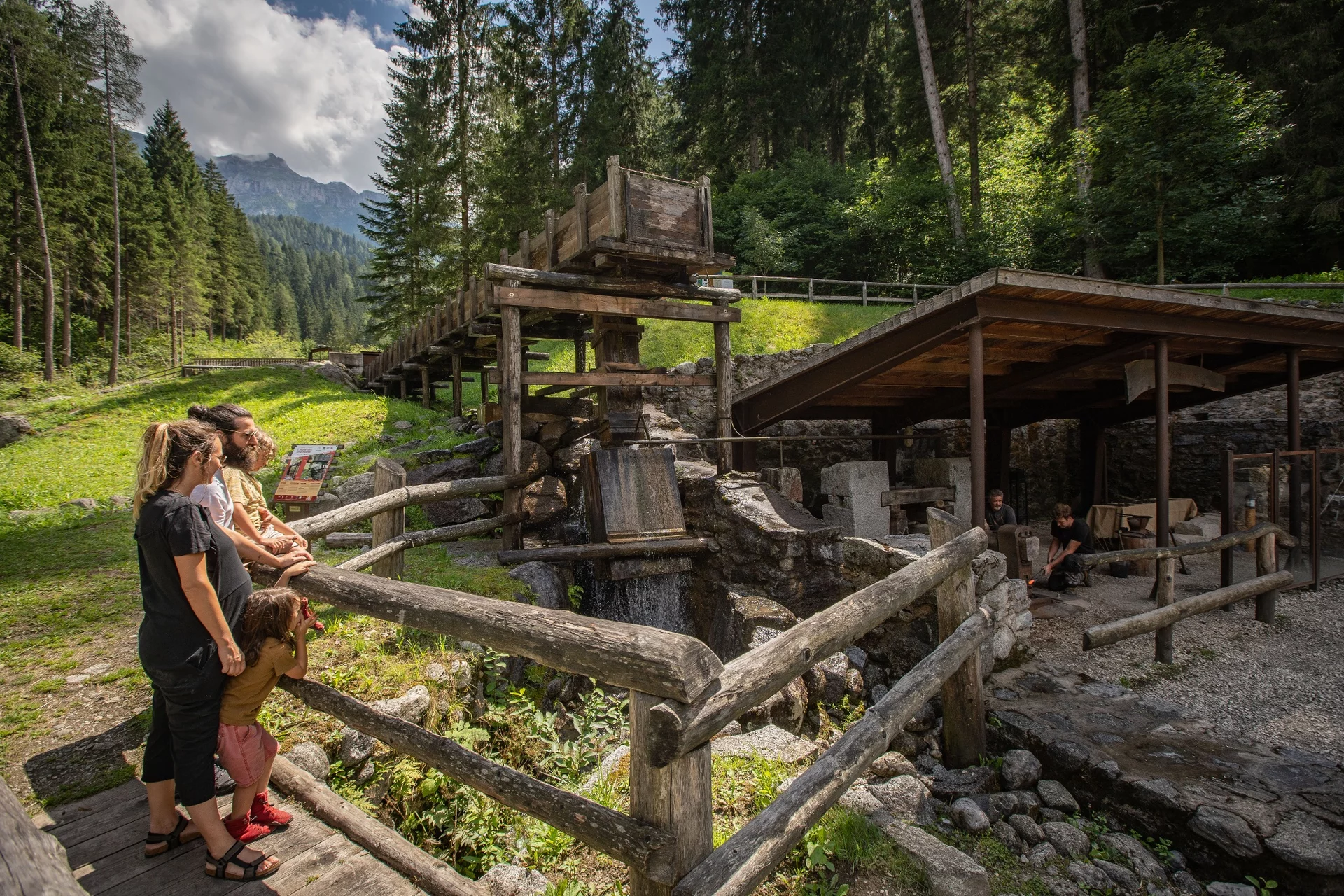 La passeggiata ha come punto di partenza l’antica Segheria Veneziana che si trova all’estremità dell’abitato di Dimaro, sulla strada che porta a Madonna di Campiglio. Prenditi del tempo per visitarla e per osservare i suoi affascinanti meccanismi in legno e ferro in funzione. Dalla segheria, dopo un breve tratto di sentiero si passa sotto la strada statale con un sottopasso e s’imbocca la strada sterrata che risale lungo il torrente Meledrio. Qui si passa prima davanti ad un’antica fucina ristrutturata, poi ad una vecchia calcara, fino a giungere nei pressi della centrale idroelettrica del comune di Dimaro Folgarida. Da qui, si può rientrare a Dimaro dallo stesso percorso lungo la magnifica Val Meledrio. In alternativa, dal maglio è possibile attraversare la passerella sul torrente Meledrio, imboccando il sentiero pianeggiante della “léc” (termine dialettale per definire il canale di irrigazione per le campagne, ora in disuso) che porta in località “Gnoca” dove è presente un piccolo parco. Da qui si scende fino alla chiesa di Carciato per poi rientrare a Dimaro tramite comodo marciapiede.