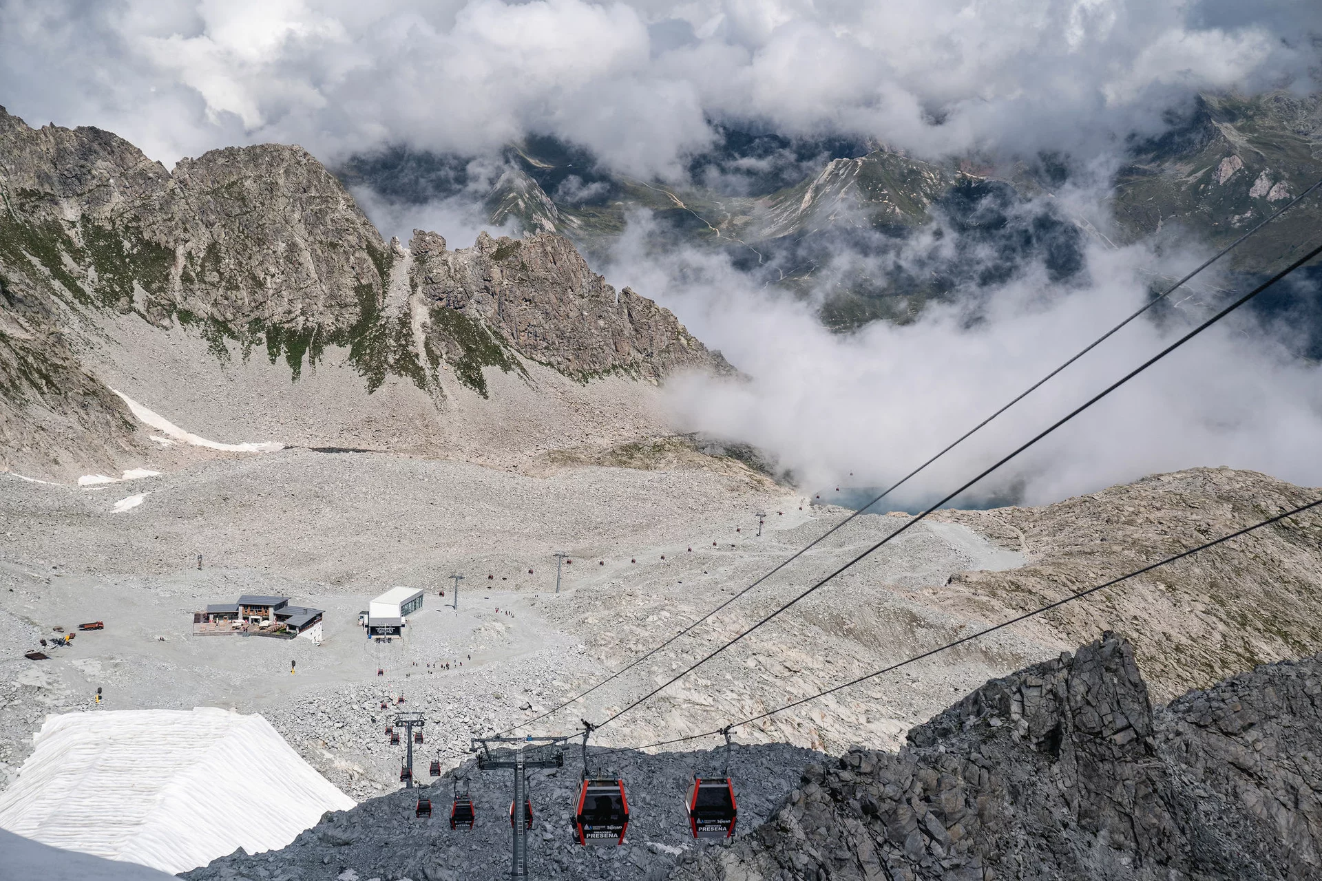 Giunti in vista della testa al vallone, notiamo davanti a noi i resti di un villaggio militare austriaco, travolto da una terribile valanga nella notte di Santa Lucia del 1916. Con una serie di tornanti superiamo una pietraia fino ad arrivare in testa al vallone, in prossimità dei ruderi militari. Da lì, a mezzacosta, giungiamo su comodo sentiero in falsopiano al Passo Paradiso (2575 m), caratterizzato dai laghetti del Monticello e dall'imponente cabinovia. Nei pressi di quest'ultima si trova una ex galleria militare, adibita a museo interattivo della Guerra Bianca. Innanzi si erge il Passo Presena, con quel che resta del suo ghiacciaio, coperto dai teloni protettivi per ritardarne lo scioglimento (e consentire così la discesa con gli sci). Da qui, per proseguire, ci sono più possibilità: la via ferrata Sentiero dei Fiori, che corre lungo la cresta di Lagoscuro, oppure l’ovovia che conduce fino a Passo Presena, se il Sentiero dei Fiori è al di sopra delle proprie possibilità, o in caso di maltempo o nevai residui.