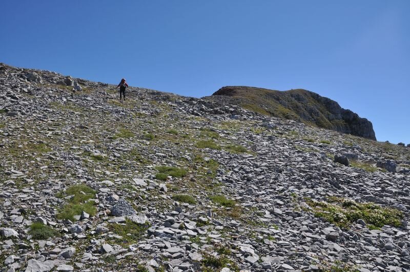 Il sentiero risale il pendio sempre più ghiaioso che conduce in direzione dello sperone roccioso che sovrasta il passo.