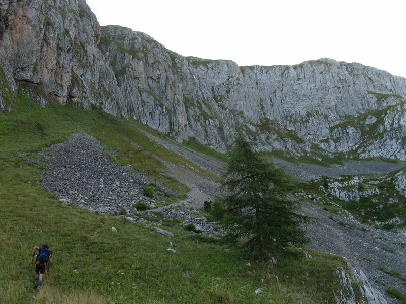 Sempre nel bosco il sentiero sale, ora con pendenza ridotta, a monte di alcune fasce rocciose e raggiunge, dopo un ultimo tratto pianeggiante, il prato di malga Scale (1564m).