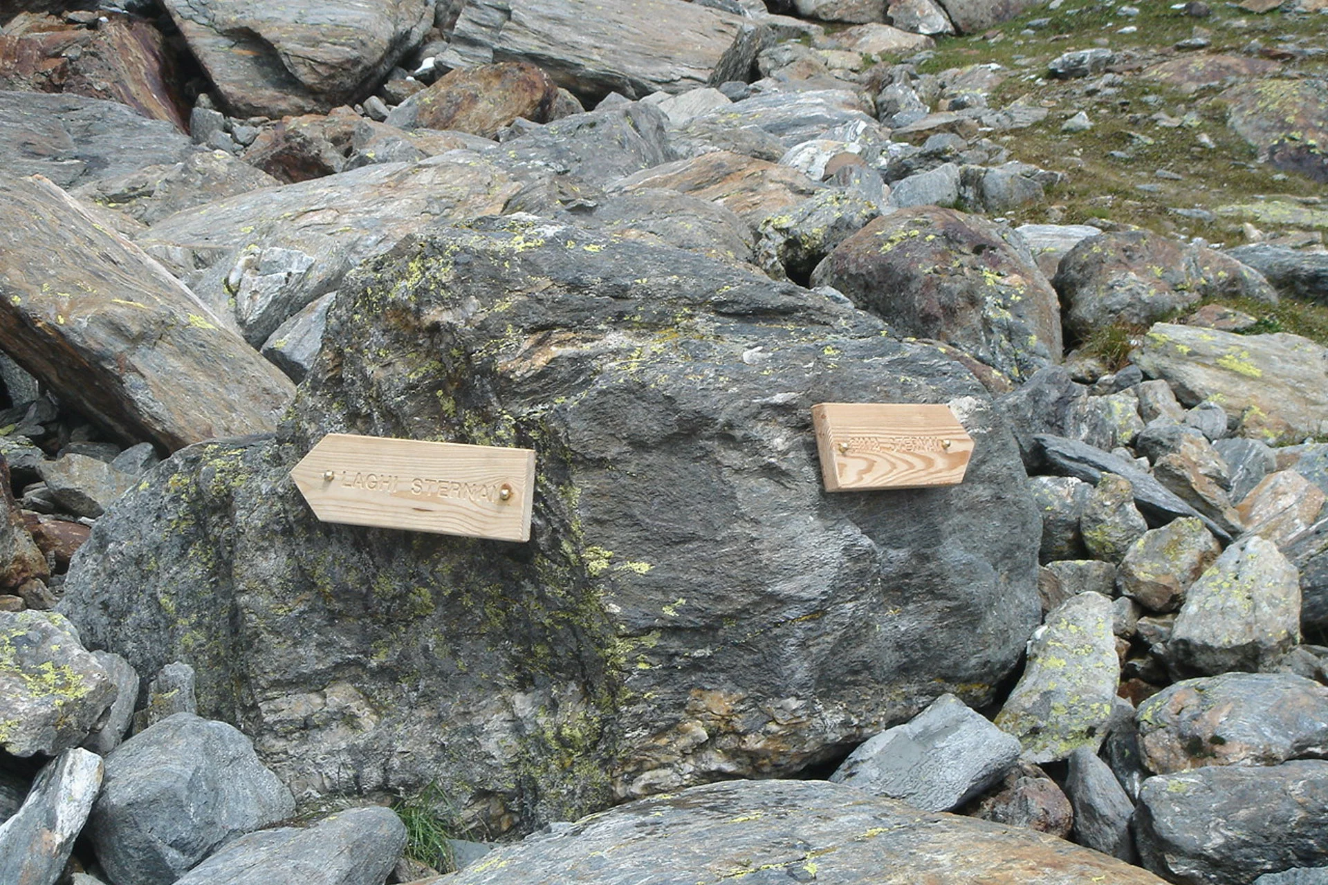 Da qui la salita al Lago Sternai dove si trovano gli ometti per orientarsi attorno ai laghi Sternai. Una volta arrivati vicino all'incrocio indicato da un grande cartello in larice (2.700m), procedere seguendo gli ometti di pietra fino a raggiungere la Cima Sternai (3.443m). La vetta di Sternai, specialmente dopo la fine di luglio, richiede l’uso dei ramponi. Corda e imbrago sono indispensabili per assicurarsi agli ancoraggi in acciaio già fissati alle rocce.