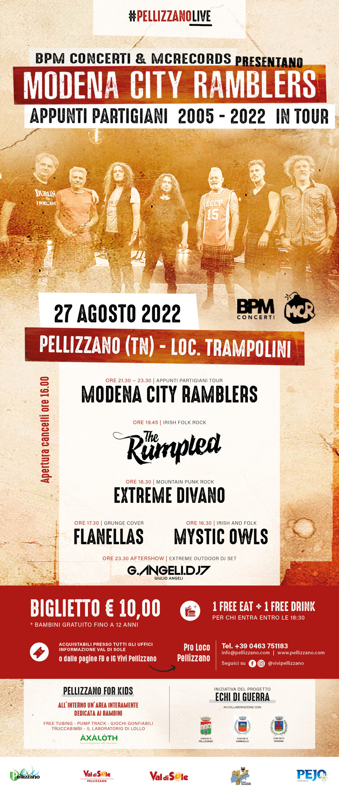 Modena City Ramblers. E sai cosa ascolti. Sabato 27 agosto a Pellizzano, i gladiatori del combact folk sono in tour con Appunti Partigiani 2005-2022, una raccolta di canzoni che parlano di guerra e il parallelismo con l’oggi salta agli occhi.