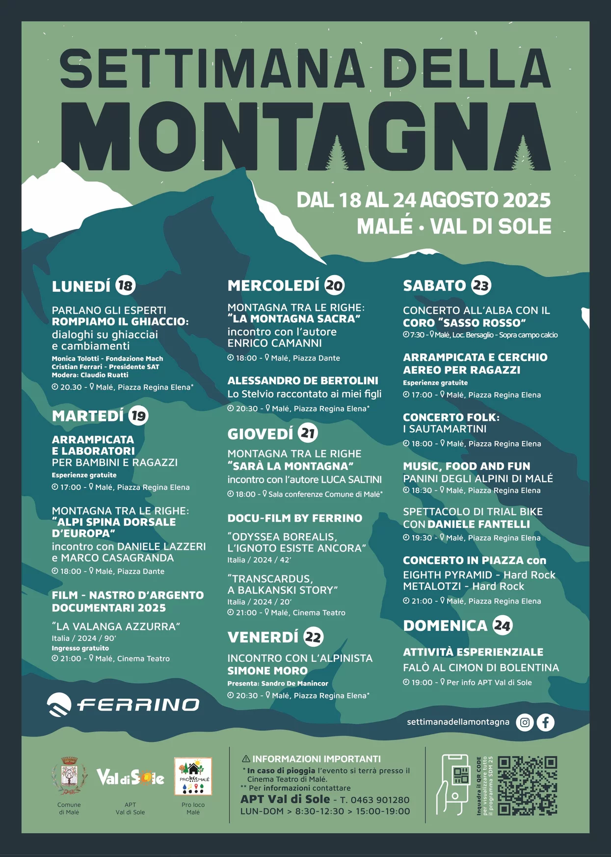 La Settimana della Montagna di Malè è un evento ricco di incontri e conferenze, proiezioni gratuite del Trento Film festival, attività per bambini e ragazzi con Guide e Soccorso Alpino, trekking, musica dal vivo e tanto altro.